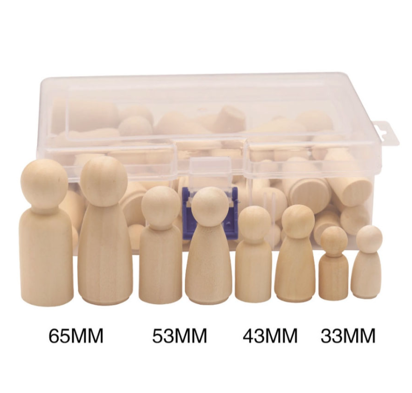 Setul include: 50 de bucati de figurine PEG Doll Natur in 4 dimensiuni diferite intr-o cutie de plastic cu capac :