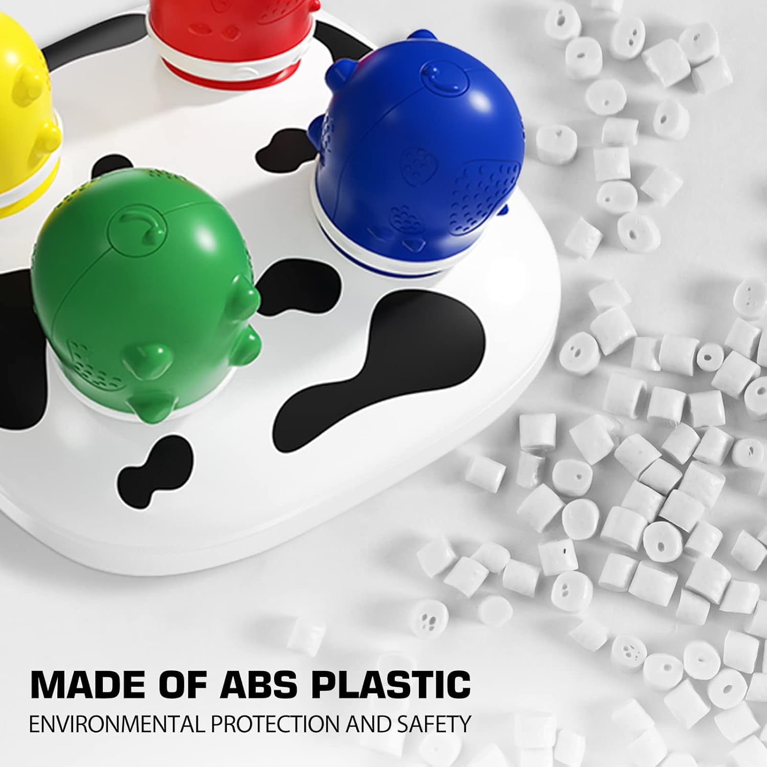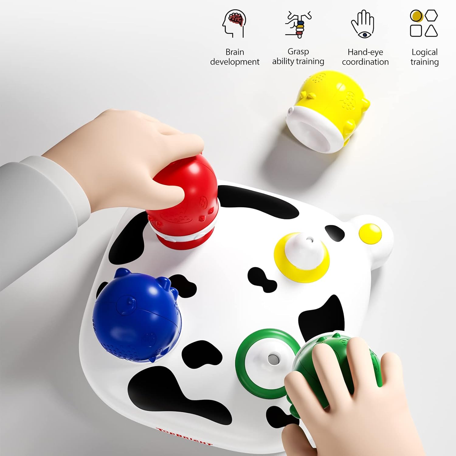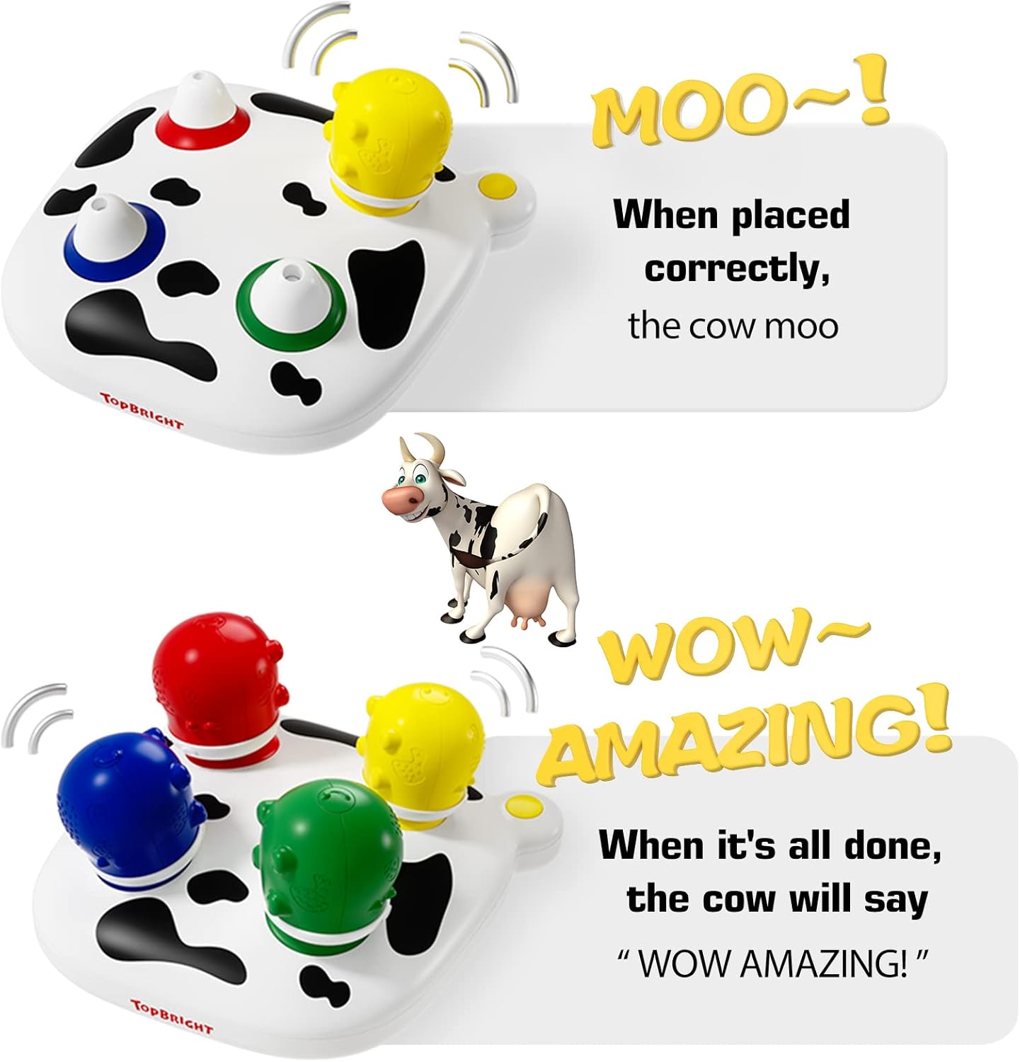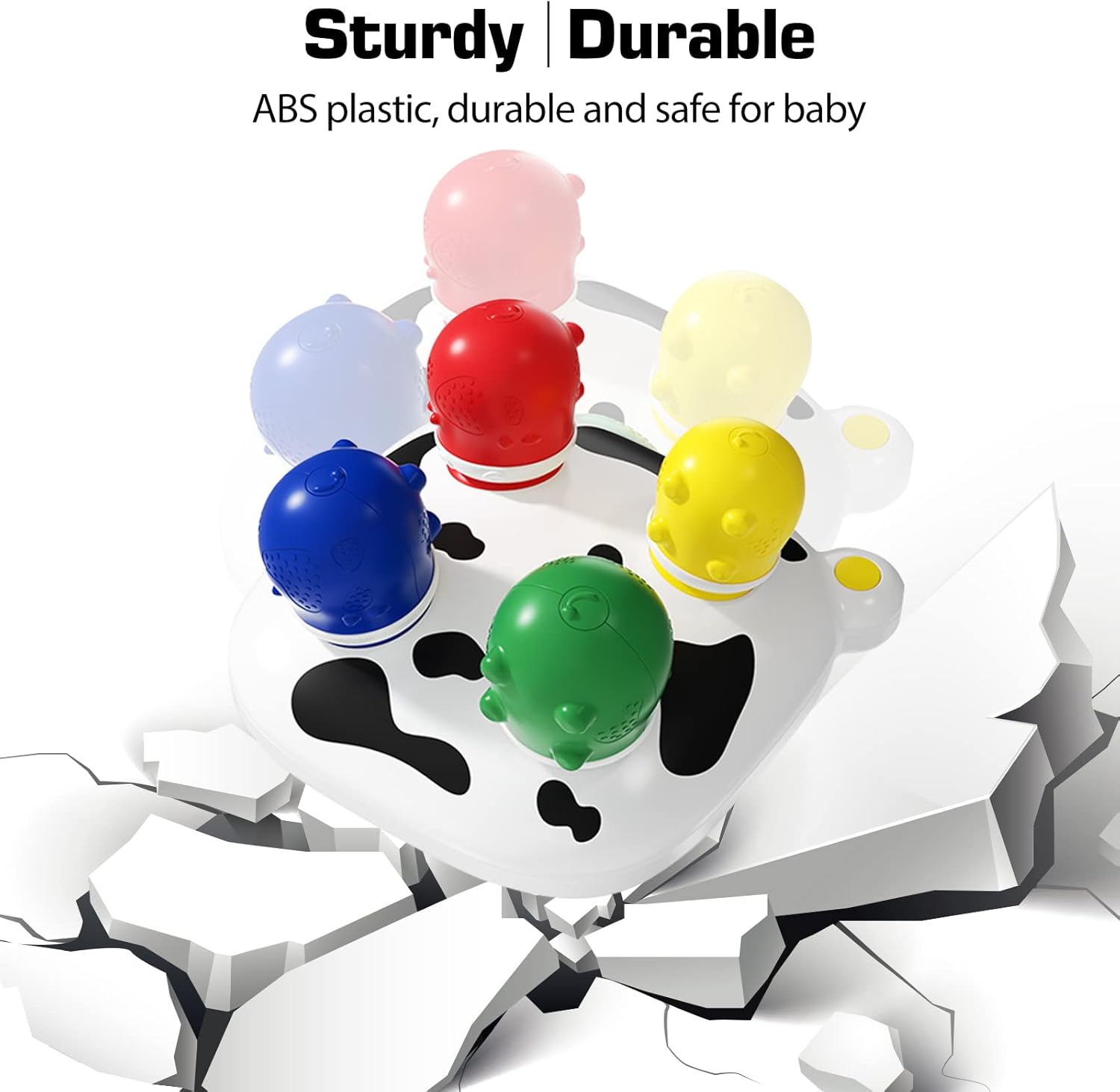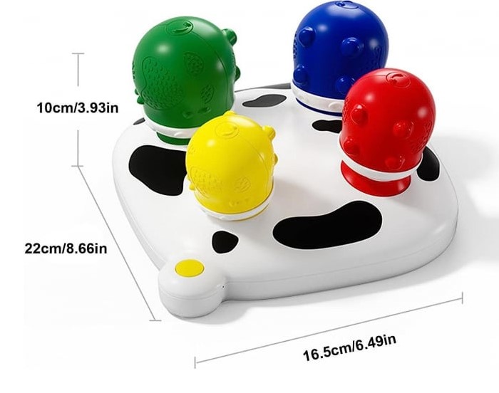 Atunci când piesele sunt plasate corect pe suport, jucăria oferă efecte sonore amuzante („muu” ca o vacă sau expresia „Wow Amazing!”), transformând joaca într-o experiență plină de surprize. Datorită dimensiunilor mari și a materialului rezistent, jucăria este sigură pentru bebeluși, fiind realizată din plastic ABS non-toxic, cu margini rotunjite.