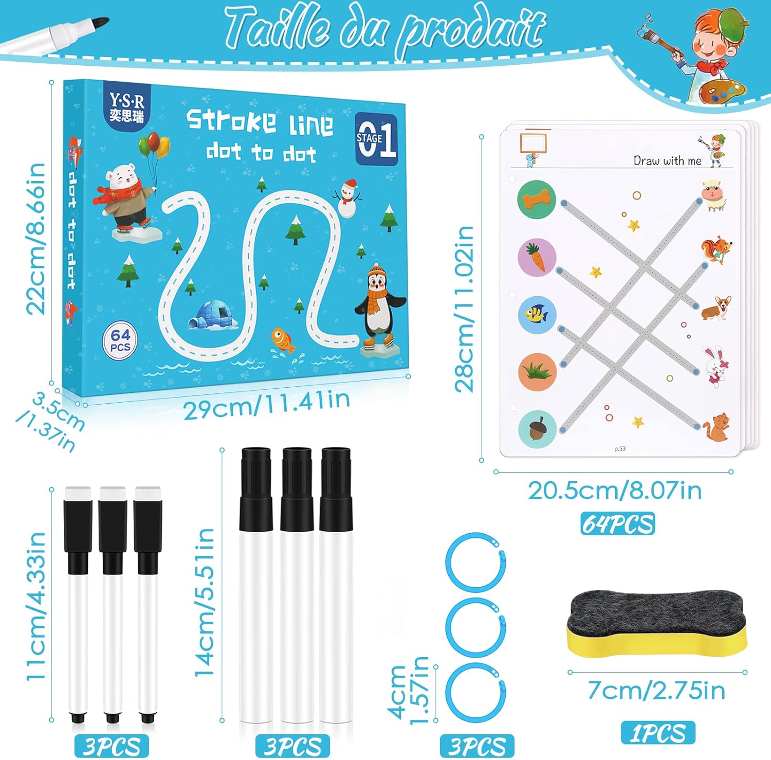Acest set educativ este ideal pentru copii cu vârsta de 3 ani și mai mult, oferindu-le ocazia de a învăța prin joacă. Jocul conține 64 de fise reutilizabile cu diverse activități și modele, menite să stimuleze coordonarea mână-ochi, dezvoltarea motricității fine și să pregătească copiii pentru scris.