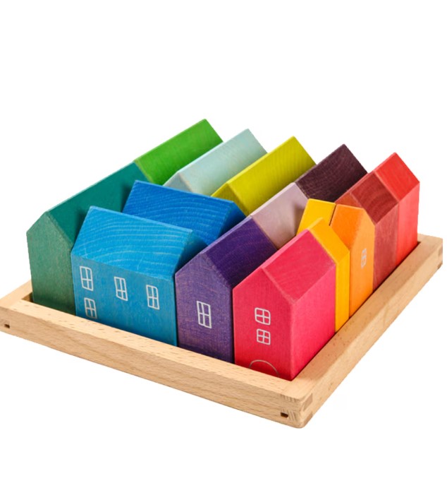 15 căsuțe din lemn în culorile curcubeului (diverse forme și dimensiuni)