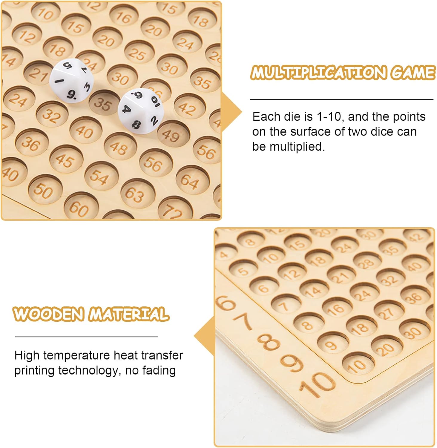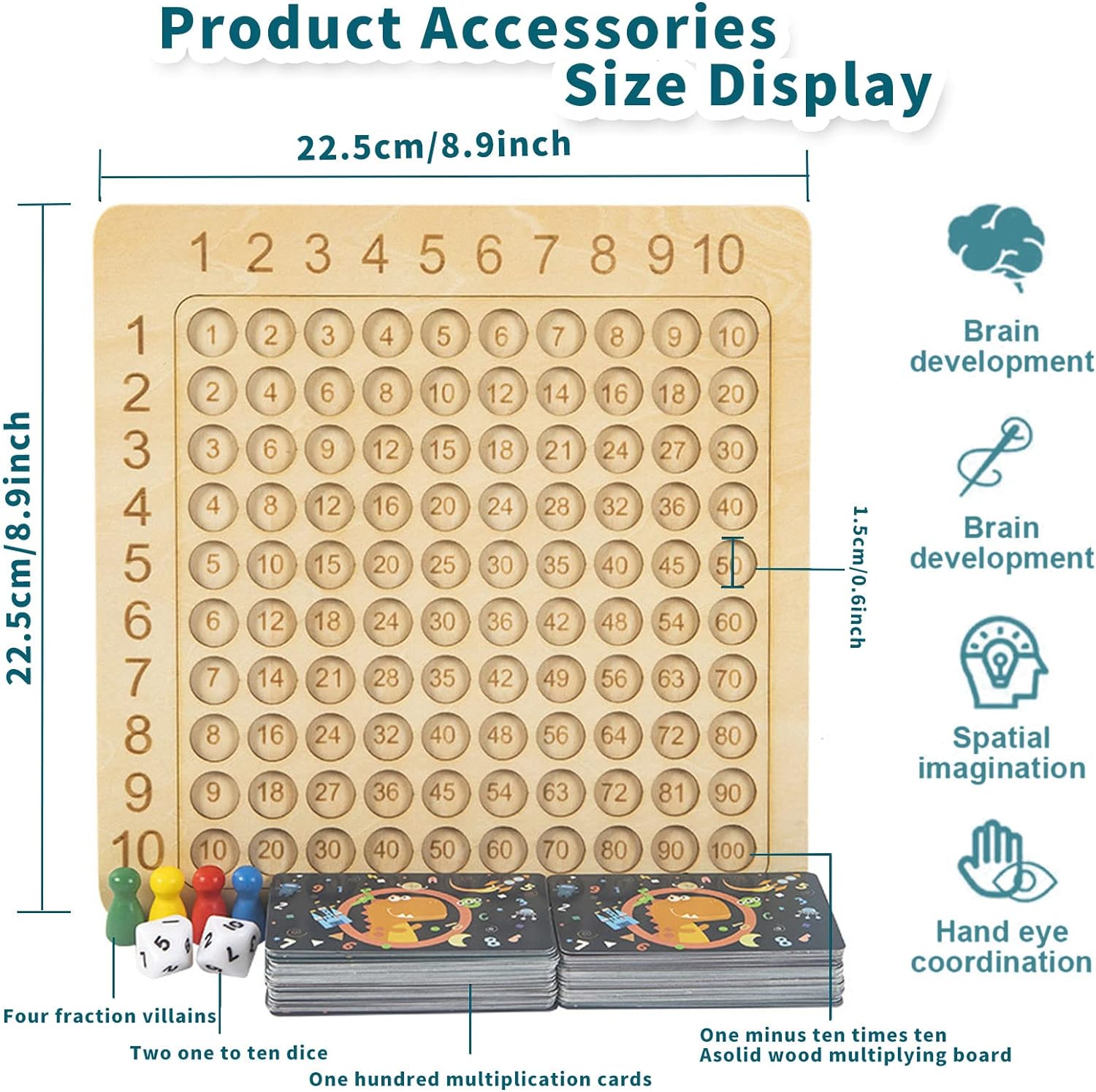 Veți primi 1 x tablă de înmulțire din lemn, 2 x zaruri de joc, 4 x pioni, 100 x carduri de înmulțire, potrivite pentru jocuri competitive multiplayer și materiale de învățare.
