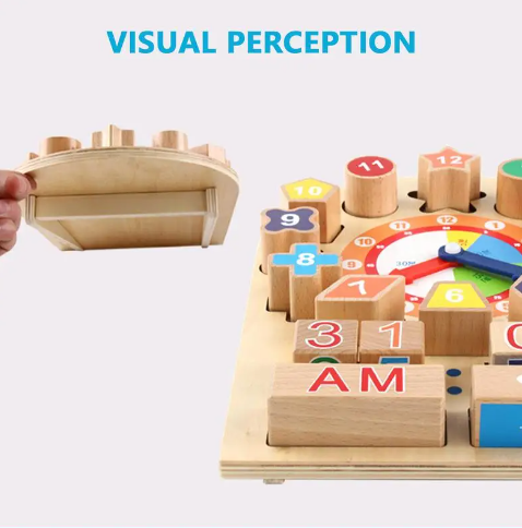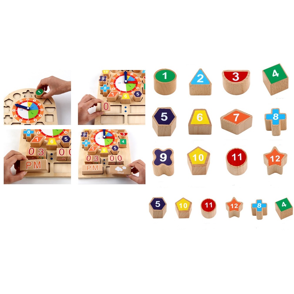 Jocul ceas din lemn, poate starni interesul copilului cu activitatile lui, vreme, ceasul, forme geometrice, precum si alte functii.