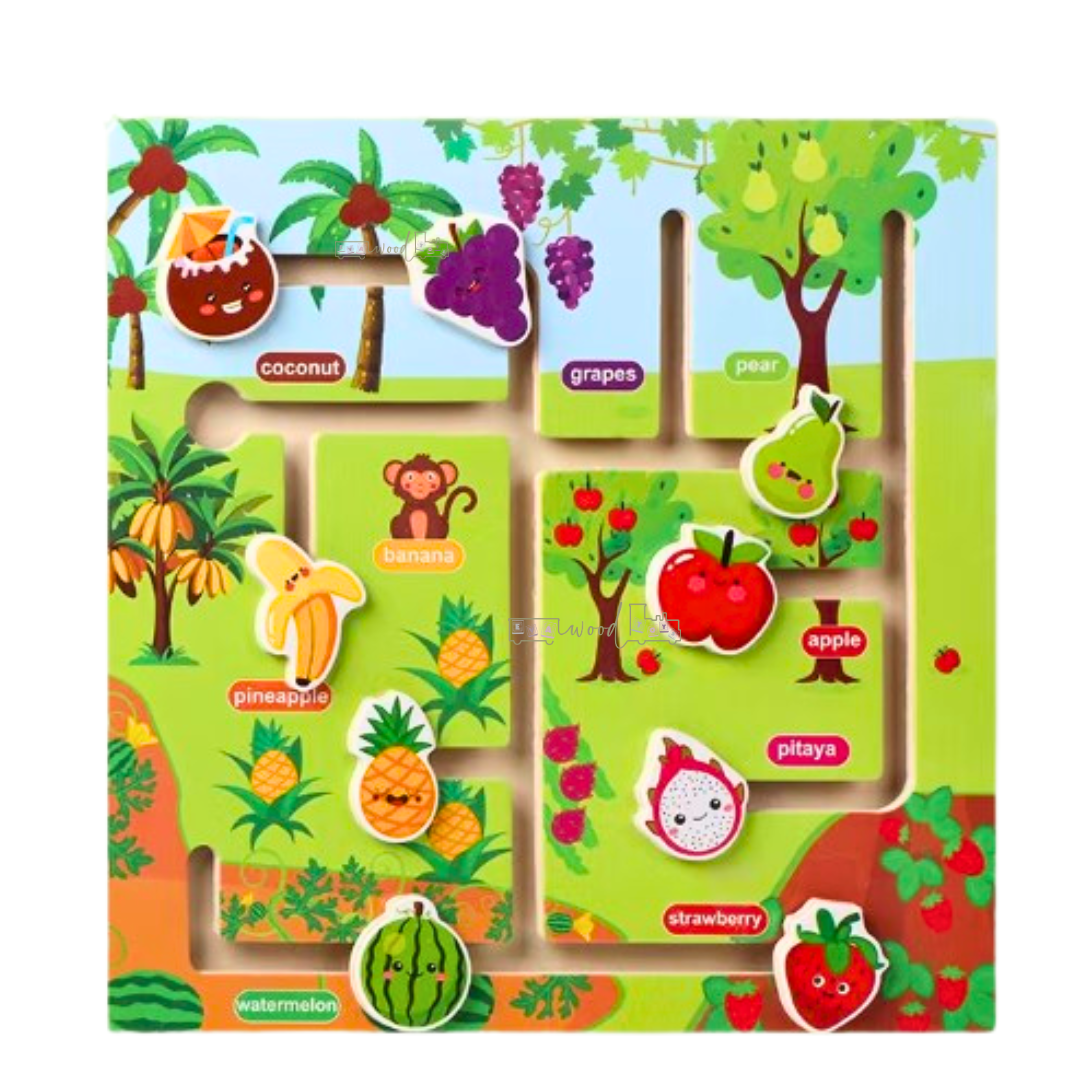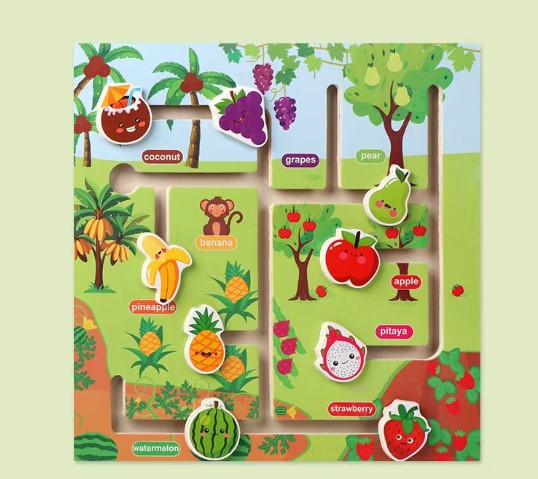 Un joc distractiv și educativ, ideal pentru micii exploratori! Acest labirint din lemn cu tematică de fructe este perfect pentru copiii de peste 3 ani care învață să recunoască forme, culori, fructe și să-și dezvolte gândirea logică și motricitatea fină. Fiecare fruct este ilustrat cu un design prietenos și viu colorat, iar traseele sunt prevăzute cu canale în care copiii pot glisa piesele dintr-o zonă în alta.