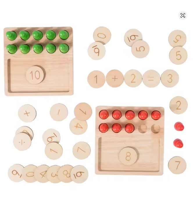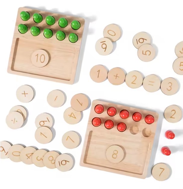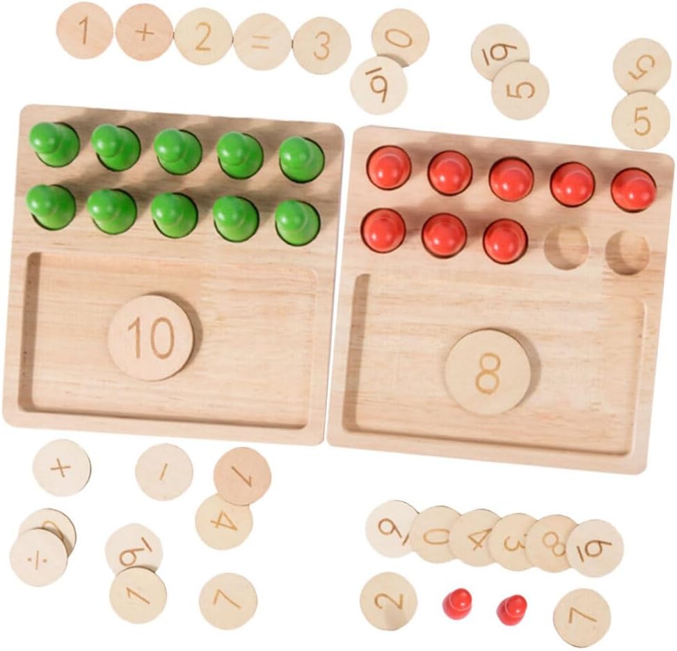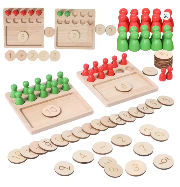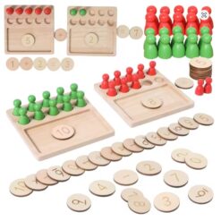 Un joc de matematică ideal pentru copiii care învață să numere, să facă primele operații aritmetice și să dezvolte gândirea logică. Inspirat din pedagogia Montessori, acest set de numărare include pioni colorați și discuri din lemn cu cifre și semne matematice, perfecte pentru activități educative prin joacă.