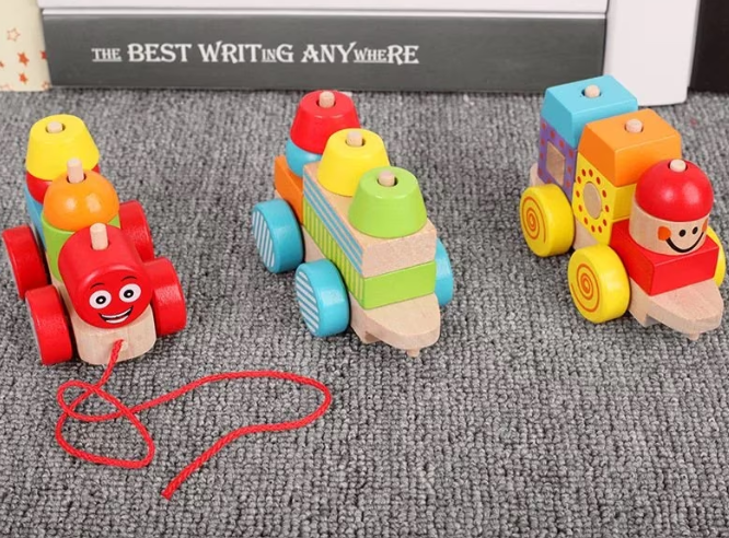 - Dezvoltarea coordonării mână-ochi: Copiii își exersează abilitățile motorii fine prin manipularea și stivuirea blocurilor de lemn pe vagoane.
