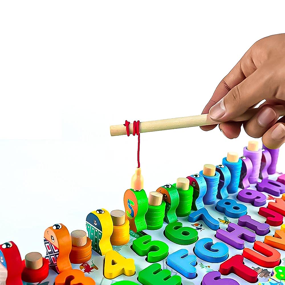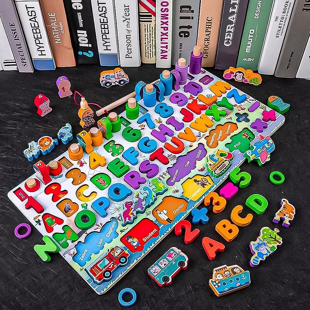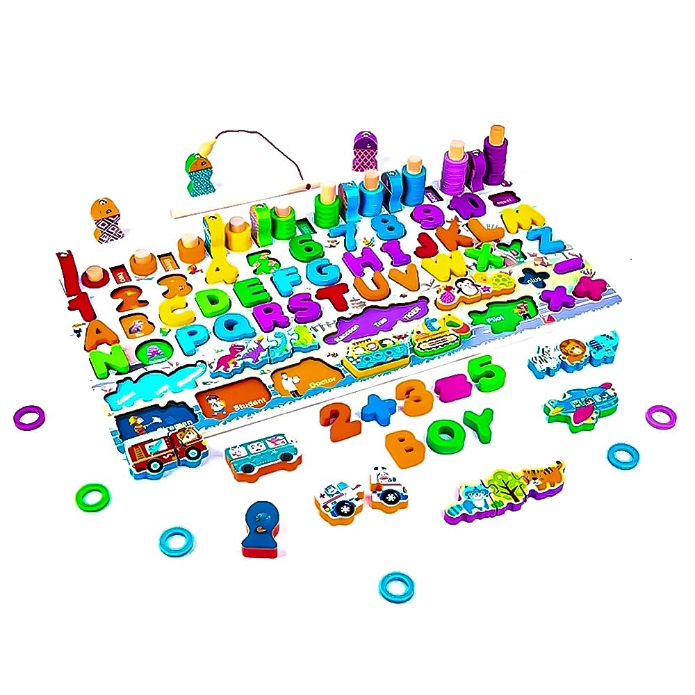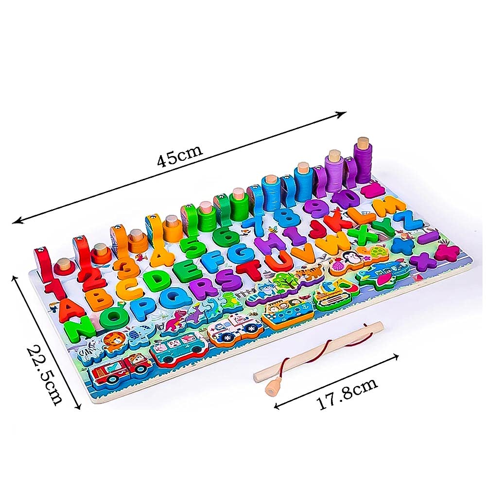 Un joc educativ 7 în 1, realizat din lemn masiv și pictat în culori vesele, care combină învățarea alfabetului, a cifrelor, a formelor, a animalelor și a vehiculelor, cu jocuri interactive și motrice. O placă de activități complexă, creată pentru a dezvolta abilitățile esențiale ale copiilor prin joacă.