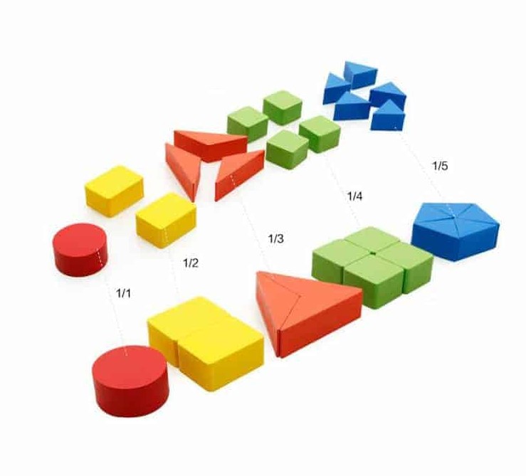 Acest joc educativ de tip Montessori îi ajută pe copii să înțeleagă, prin experiență practică, conceptele de întreg, părți egale și fracții, într-un mod vizual și intuitiv. Setul conține forme geometrice colorate – cerc, pătrat, triunghi, dreptunghi și pentagon – fiecare împărțită în părți egale (de la 1 întreg până la 1/5), pentru a ilustra noțiunile de împărțire și proporție.