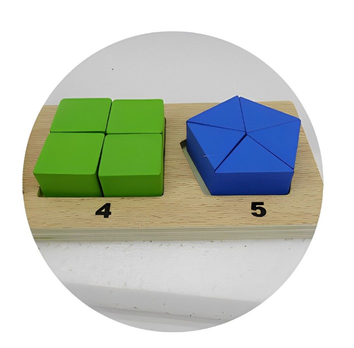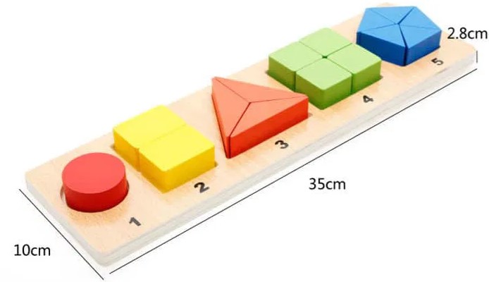 Conținut: suport din lemn cu 5 forme geometrice (cerc, pătrat, triunghi, dreptunghi, pentagon) împărțite în 1–5 părți