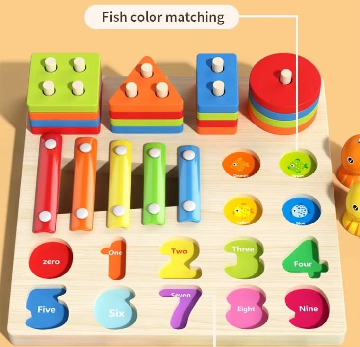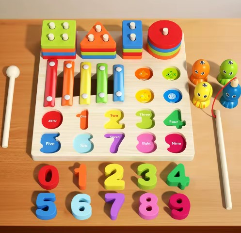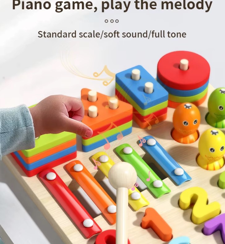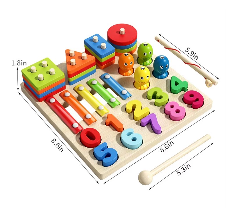 🔢 Număr piese: peste 30 de componente (forme geometrice, cifre, peștișori magnetici, baghete pentru xilofon și undiță).