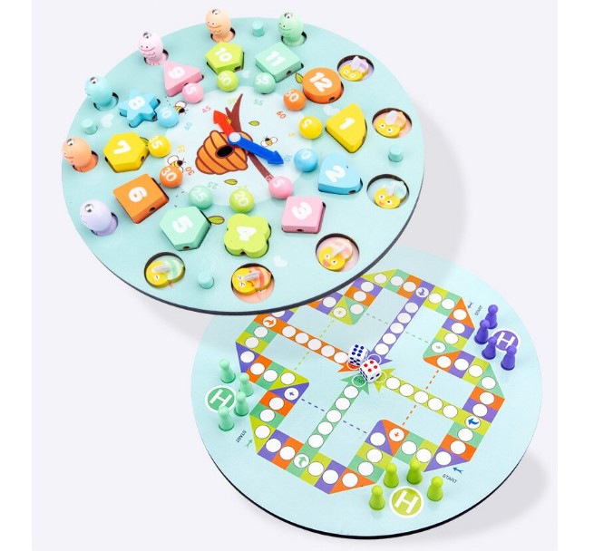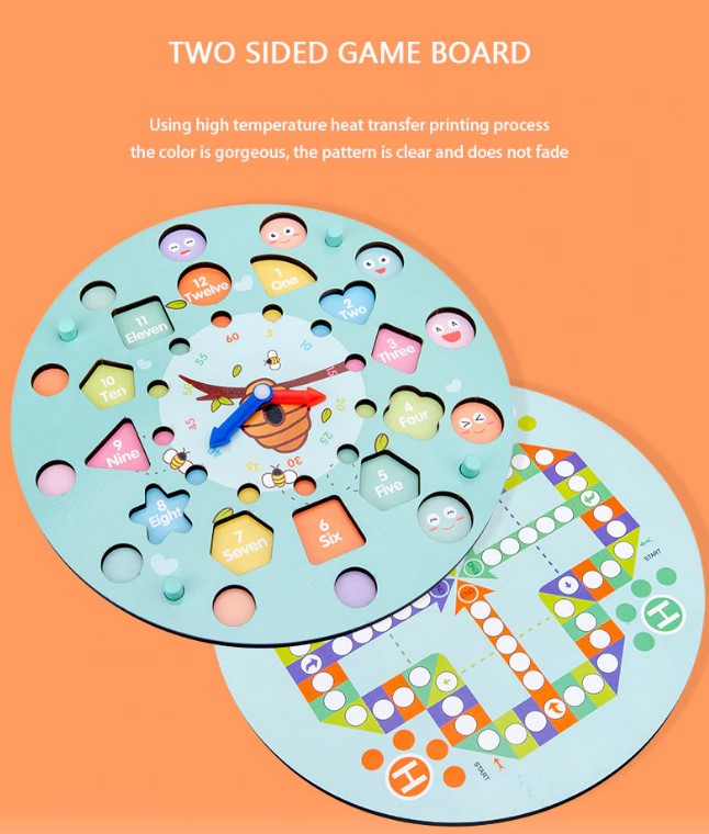 1 tablă dublă-față (ceas educativ + joc de masă pe verso)
