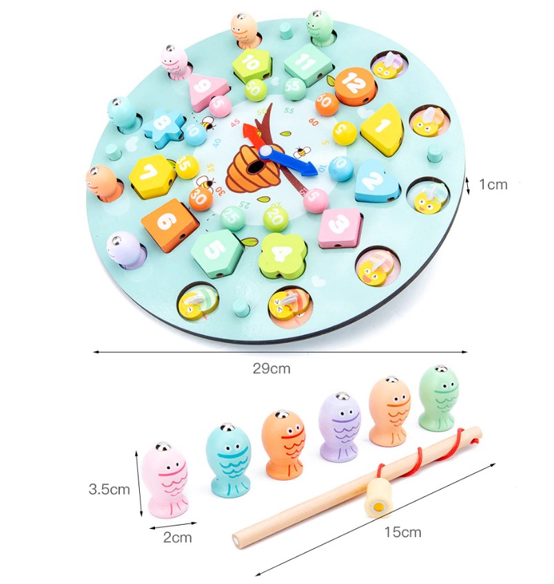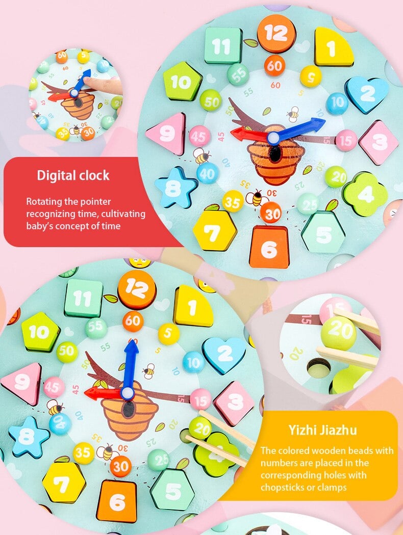 Jocul multifuncțional de tip Montessori, „Motricitate și ceas”, este o jucărie educativă completă destinată copiilor de la 3 ani. Conceput pentru a stimula curiozitatea și dezvoltarea cognitivă, acest joc îi ajută pe cei mici să învețe ceasul, să recunoască formele geometrice, culorile și numerele, dar și să își dezvolte coordonarea mână-ochi și motricitatea fină.