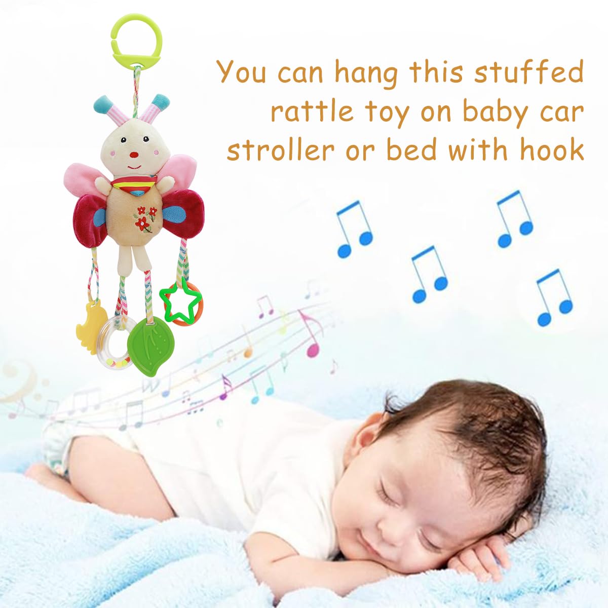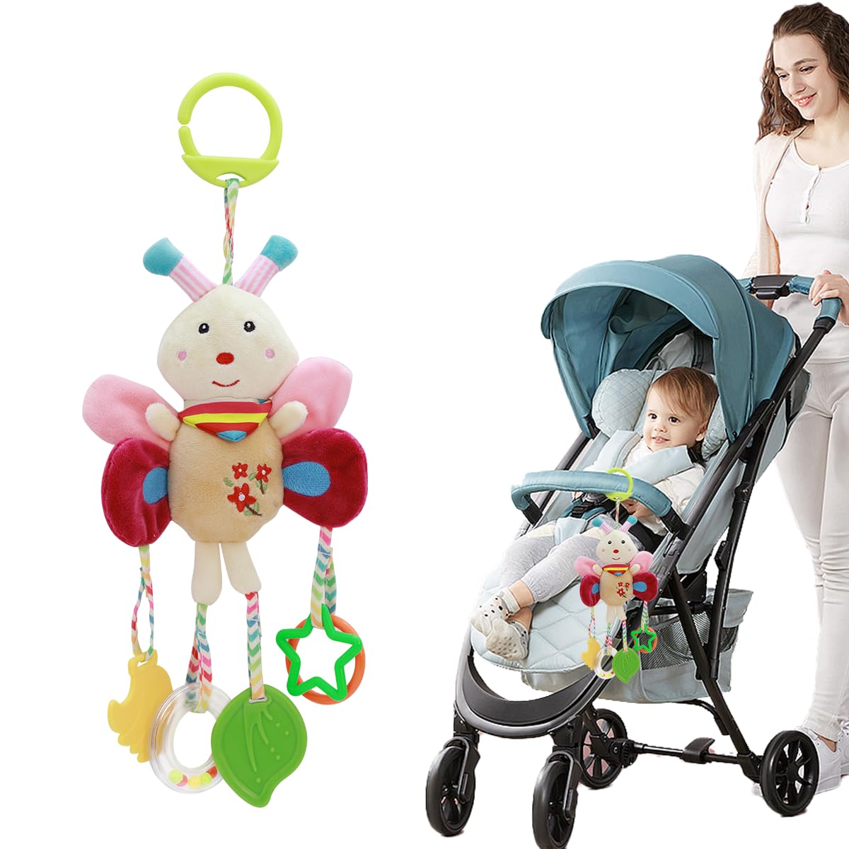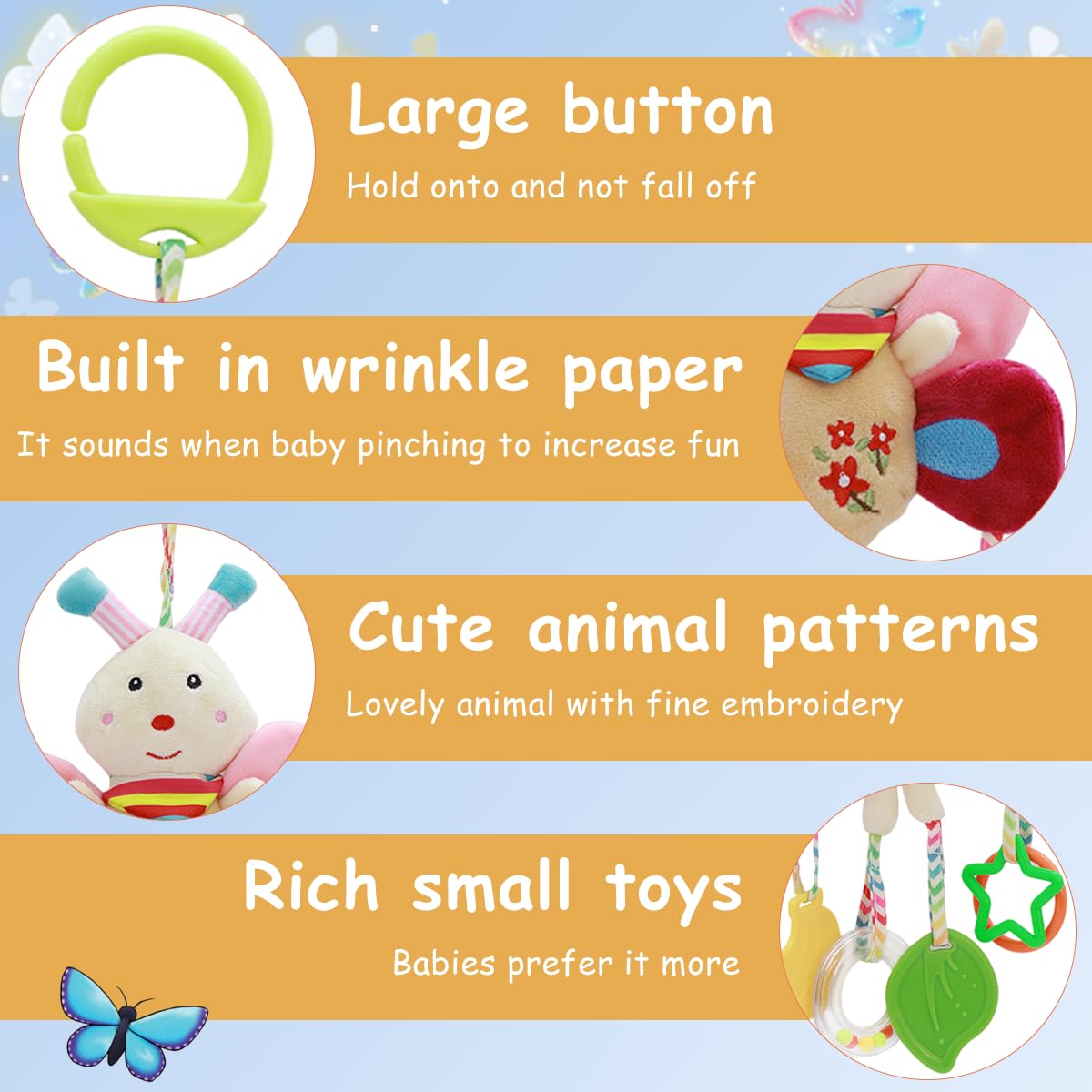 - Funcționalitate multiplă: Poate fi agățată cu ușurință pe pătuț, cărucior sau scaun auto, datorită inelului mare și rezistent. Este ideală pentru plimbări sau pentru a-i oferi bebelușului tău momente de liniște și distracție acasă.