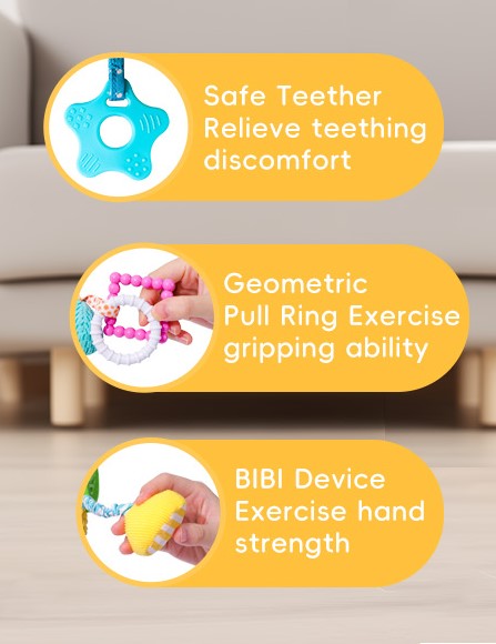 Elemente de dentiție – Include un inel special pentru dentiție, realizat din material sigur, non-toxic, care calmează disconfortul gingival al bebelușului.