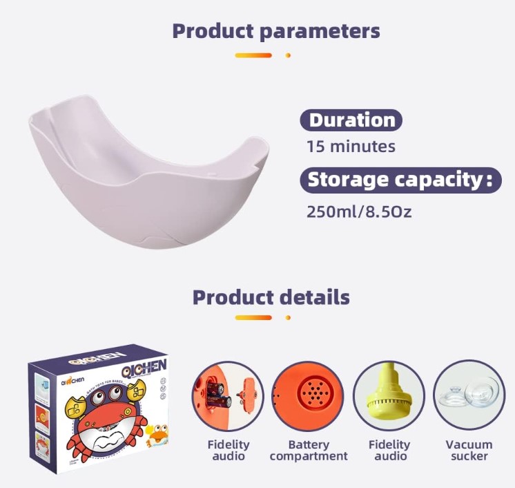 🛁 Distracție garantată: Apasă pe buton și crabul va începe să sufle baloane de săpun, aducând veselie în timpul băiței.