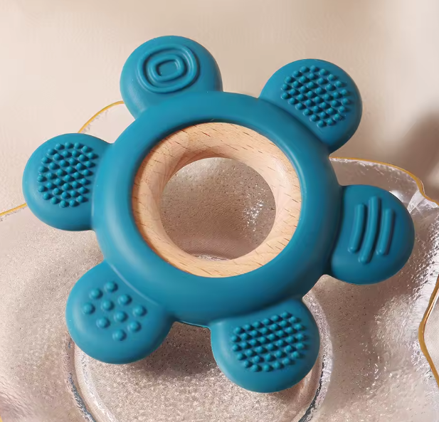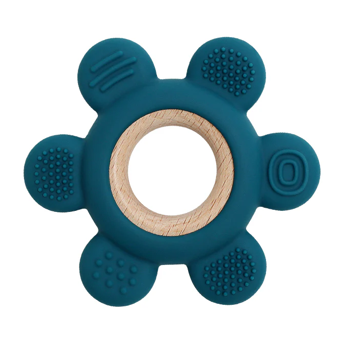 Jucarie de dentitie din silicon si lemn, Albastru Marin, 6 luni+