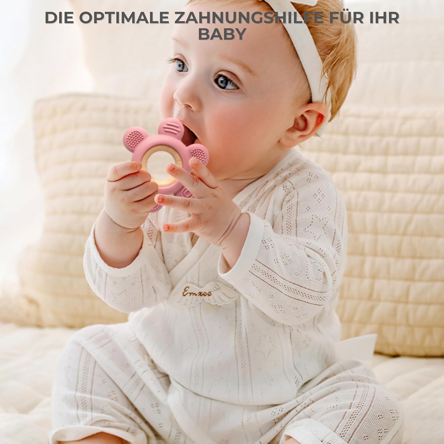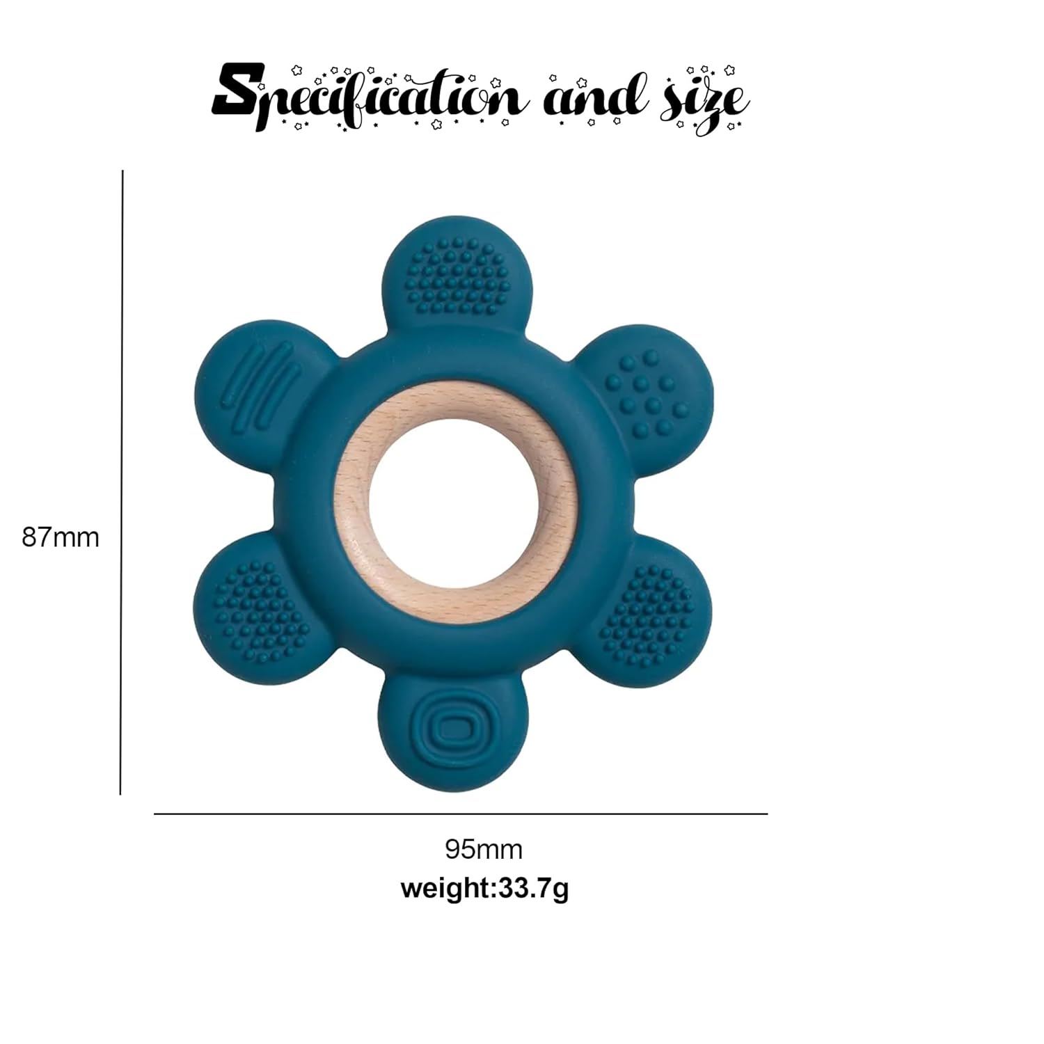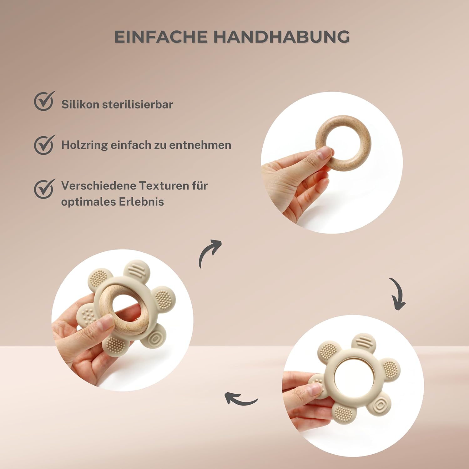 Materiale sigure: Silicon moale, 100% grad alimentar, fără BPA, ftalați sau alte substanțe toxice + inel interior din lemn de fag netratat.