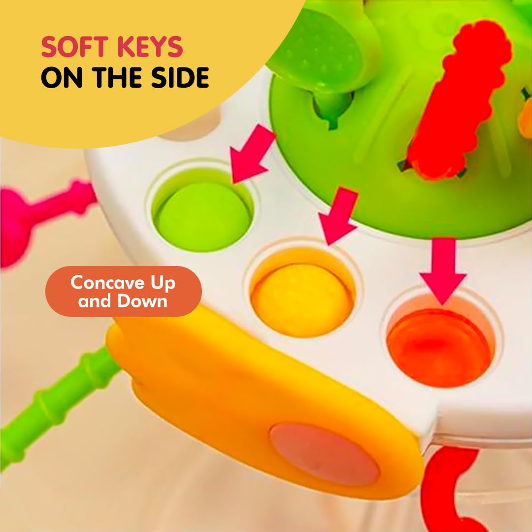 - Design Senzorial Complex: Jucăria este echipată cu mai multe corzi flexibile, fiecare având texturi și forme diferite. Aceste corzi pot fi trase de la un capăt la altul, oferind o experiență tactilă variată și contribuind la dezvoltarea dexterității mâinilor bebelușului.