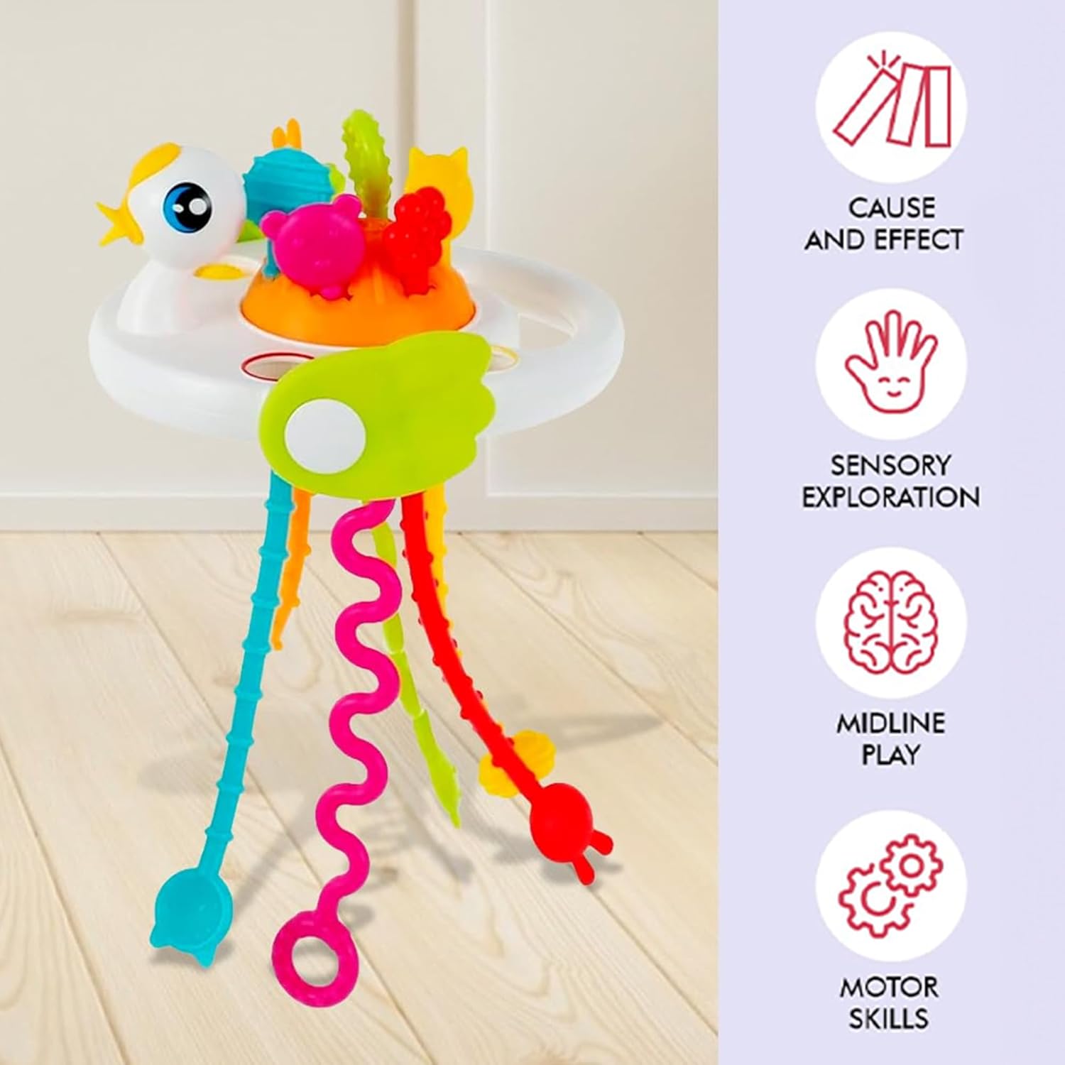 - Stimulare Vizuală și Tactilă: Culorile vibrante, formele variate și texturile multiple ajută la dezvoltarea percepției vizuale și tactile a copilului. Rățușca are elemente care pot fi apăsate, glisate și trase, toate contribuind la explorarea senzorială și învățarea cauză-efect.