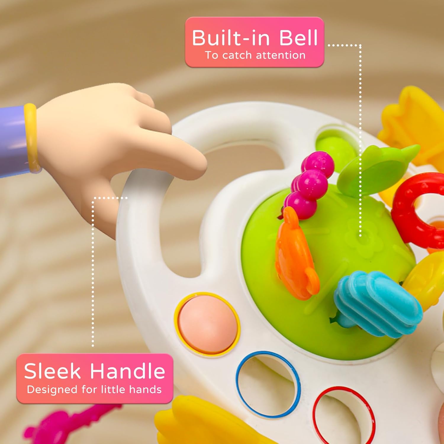 - Sunete Integrate: Jucăria are un clopoțel integrat care produce sunete plăcute, stimulând dezvoltarea auzului.