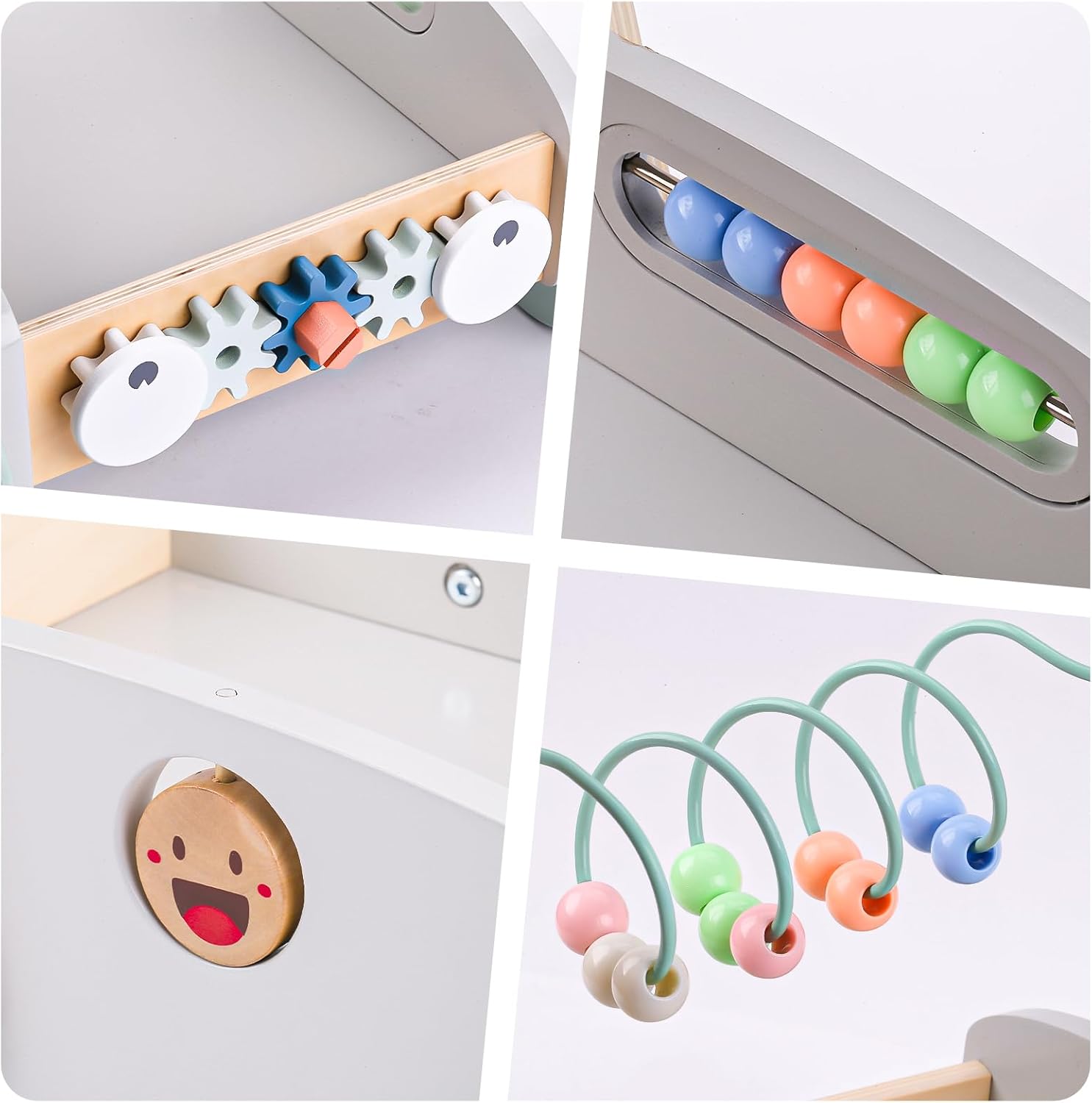 La interior, premergătorul ascunde un set generos de cuburi de construit în culori pastelate – perfecte pentru dezvoltarea coordonării mână-ochi, recunoașterea formelor și învățarea echilibrului. În partea frontală, cei mici pot roti rotițele tip angrenaj sau pot număra biluțele de pe abac, iar pe mâner se află un traseu cu mărgele pentru stimularea dexterității fine.