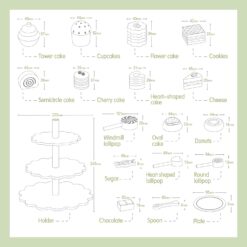 - Set Complet: Setul include prăjituri, cupcakes, și alte dulciuri, toate așezate pe un suport cu trei nivele, perfect pentru prezentarea și servirea „deserturilor”.