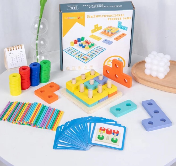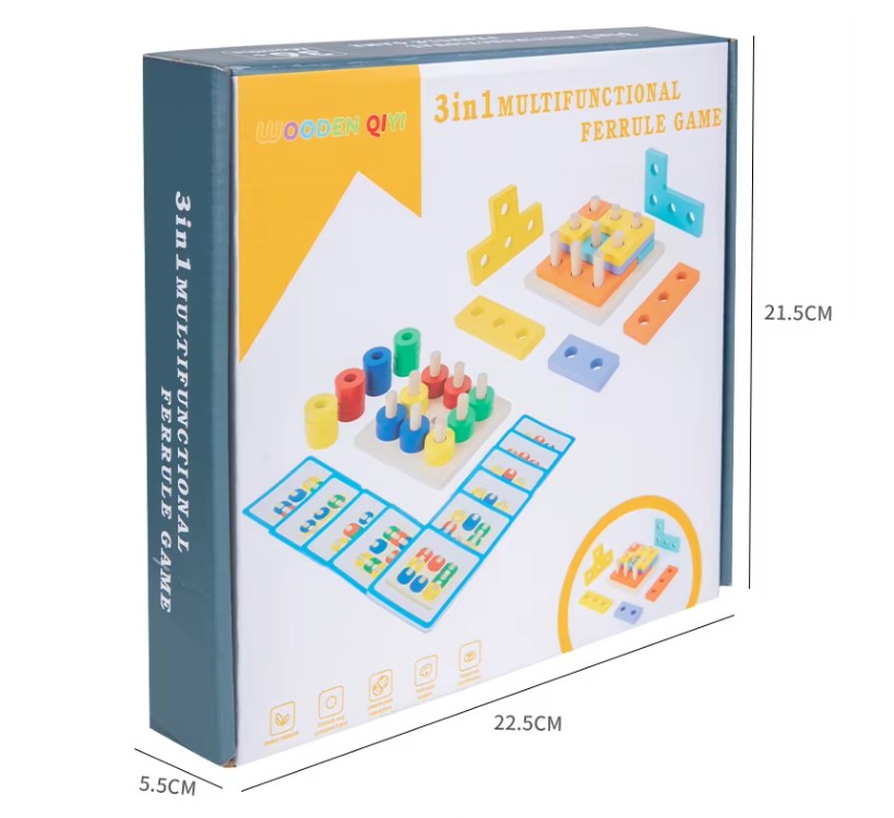 Această jucărie educativă multifuncțională este alegerea perfectă pentru copiii de peste 3 ani care învață prin joacă. Setul 3 în 1 include activități esențiale de dezvoltare: sortare de forme geometrice, recunoașterea culorilor și potrivirea pe model. Conține bețișoare, discuri colorate și plăci cu forme, toate realizate din lemn vopsit cu grijă, cu margini rotunjite pentru siguranță maximă.