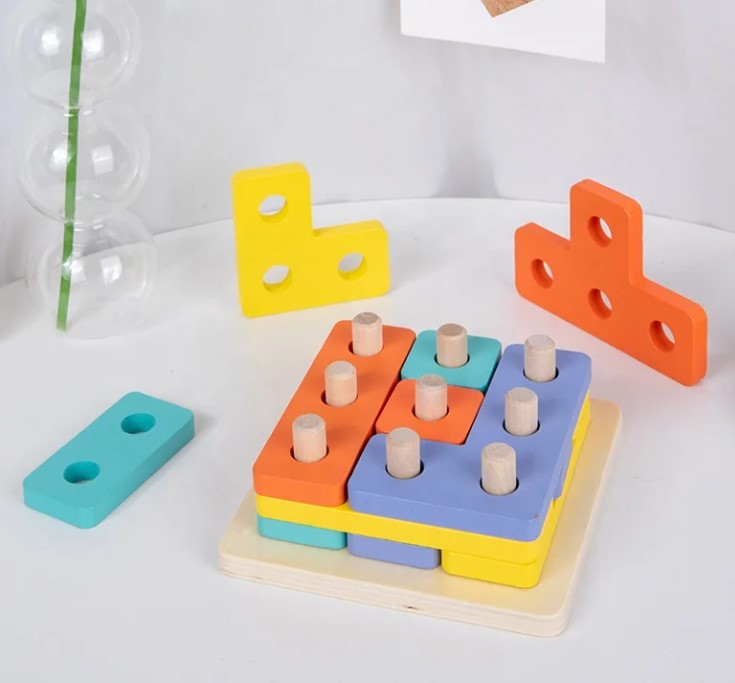 Asociere cu plăci geometrice: Plăcile se potrivesc pe stâlpi în funcție de numărul de găuri și poziționarea corectă.