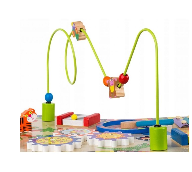 Măsuța de activități este un centru educațional complex, realizat din lemn de calitate superioară, destinat stimulării dezvoltării cognitive și motorii fine a celor mici. Aceasta oferă o experiență multisenzorială, având multiple activități interactive integrate într-un design colorat și atractiv.