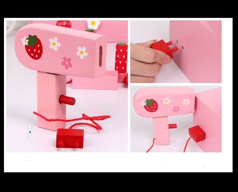 Uscător de păr cu fir și stecher (de jucărie), cu „priză” pe spatele măsuței