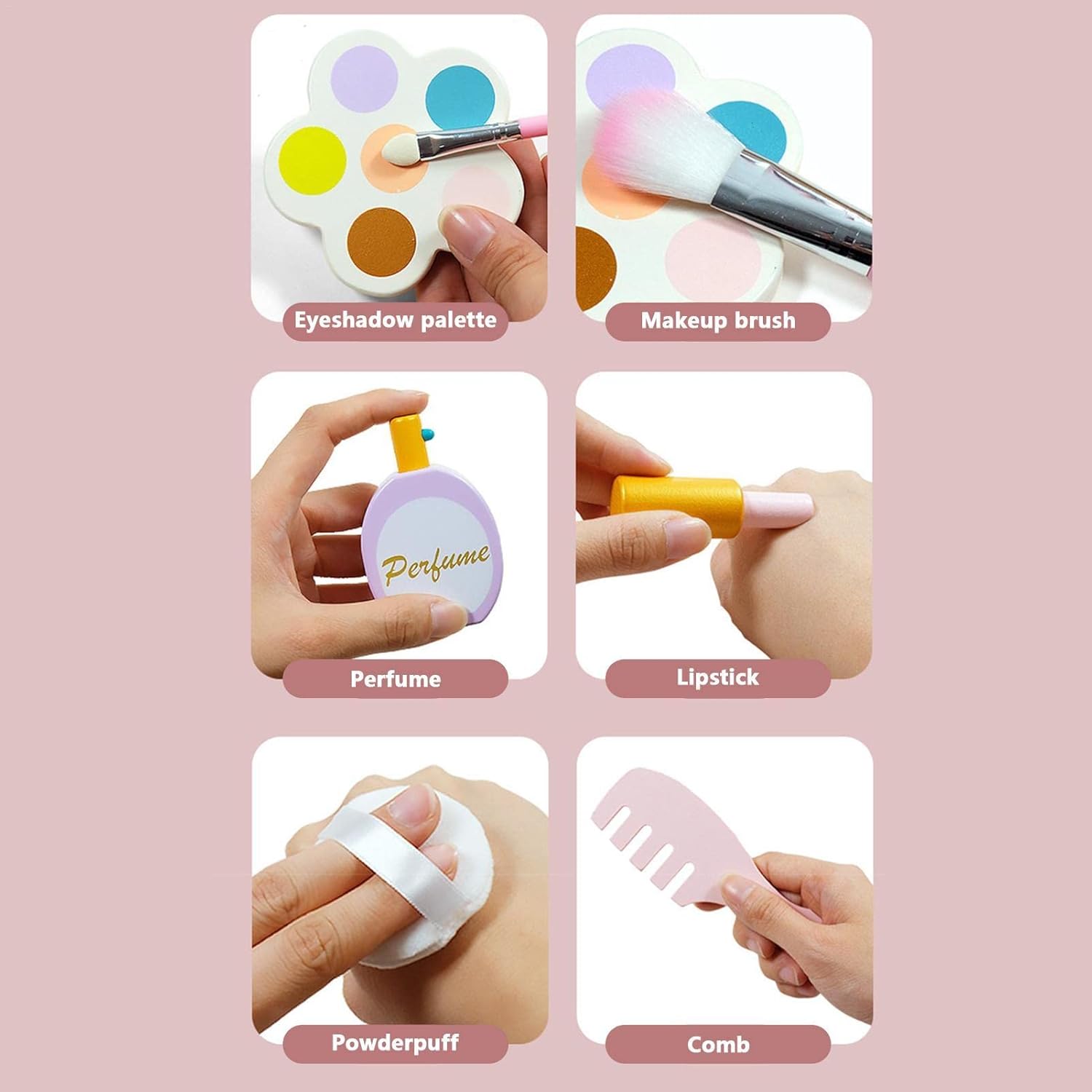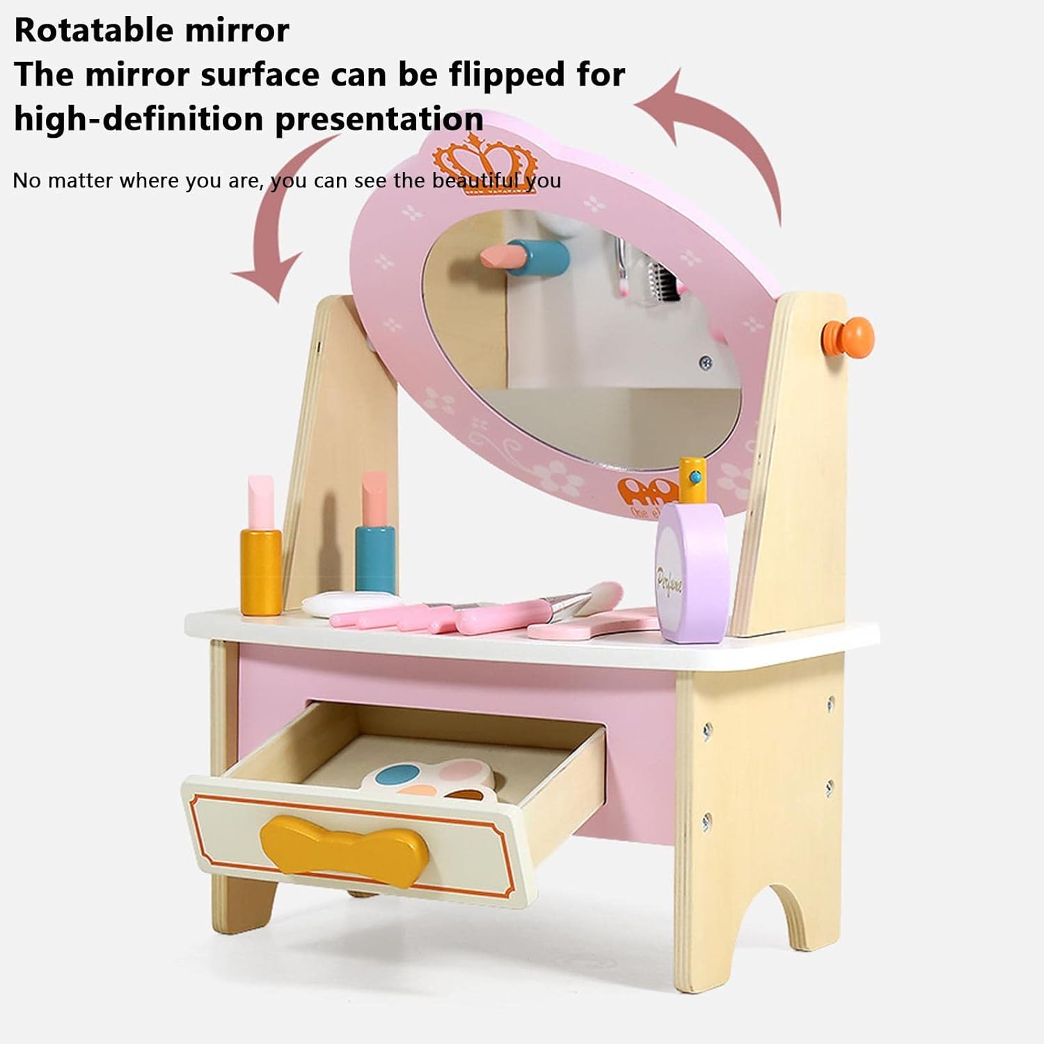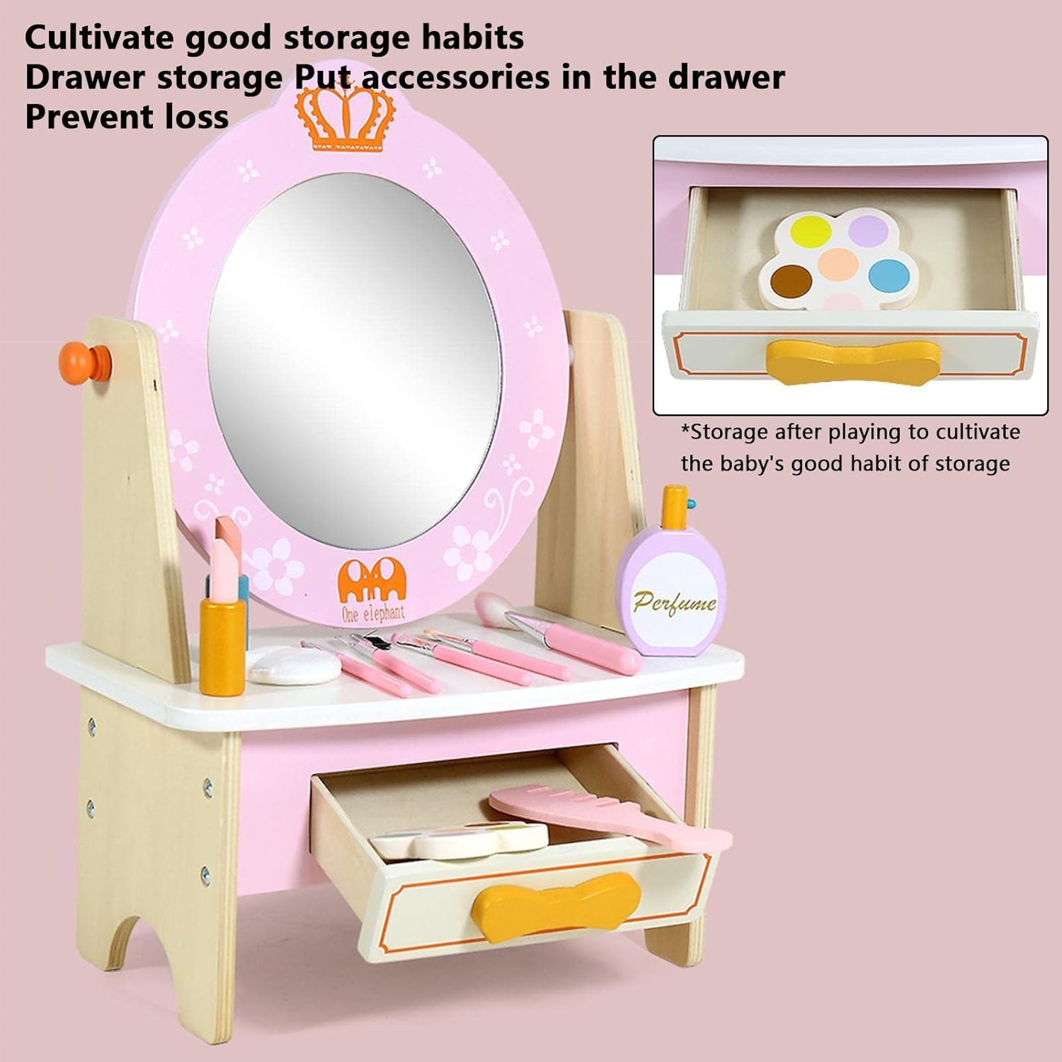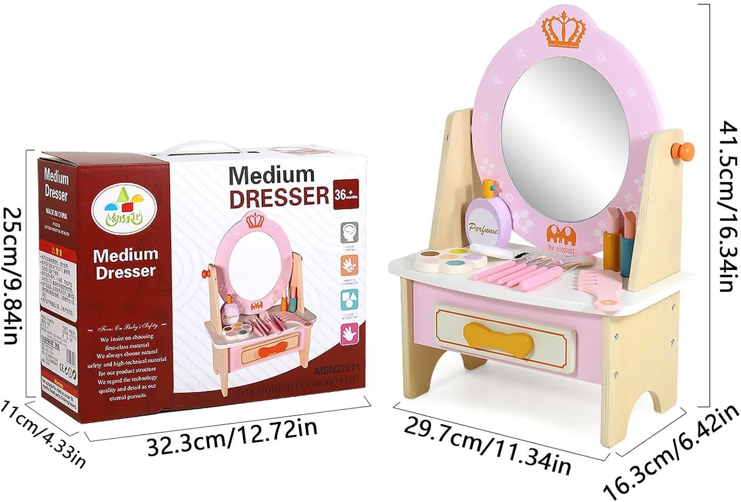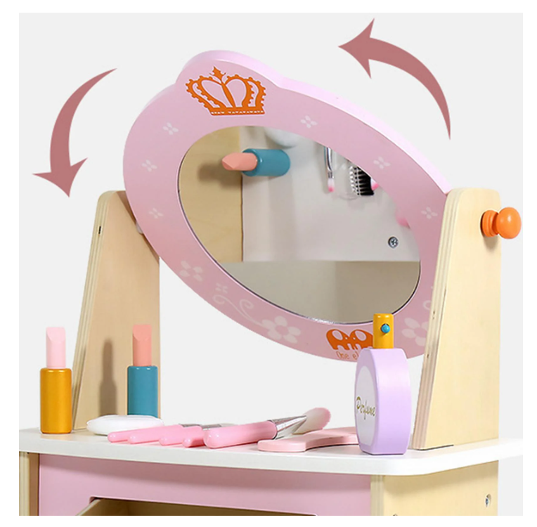 Această măsuță de machiaj din lemn este o jucărie educativă de rol perfectă pentru micile prințese care adoră să imite activitățile adulților. Cu un design elegant, în nuanțe pastelate de roz și crem, și accesorii realiste, măsuța stimulează imaginația, coordonarea și jocul creativ, oferind ore întregi de distracție.