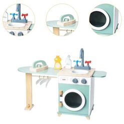 Piese incluse: masă de călcat, fier de călcat, chiuvetă cu robinete funcționale (joc simbolic), sticluțe de detergent, suport cu umerașe, mașină de spălat cu ușă care se deschide