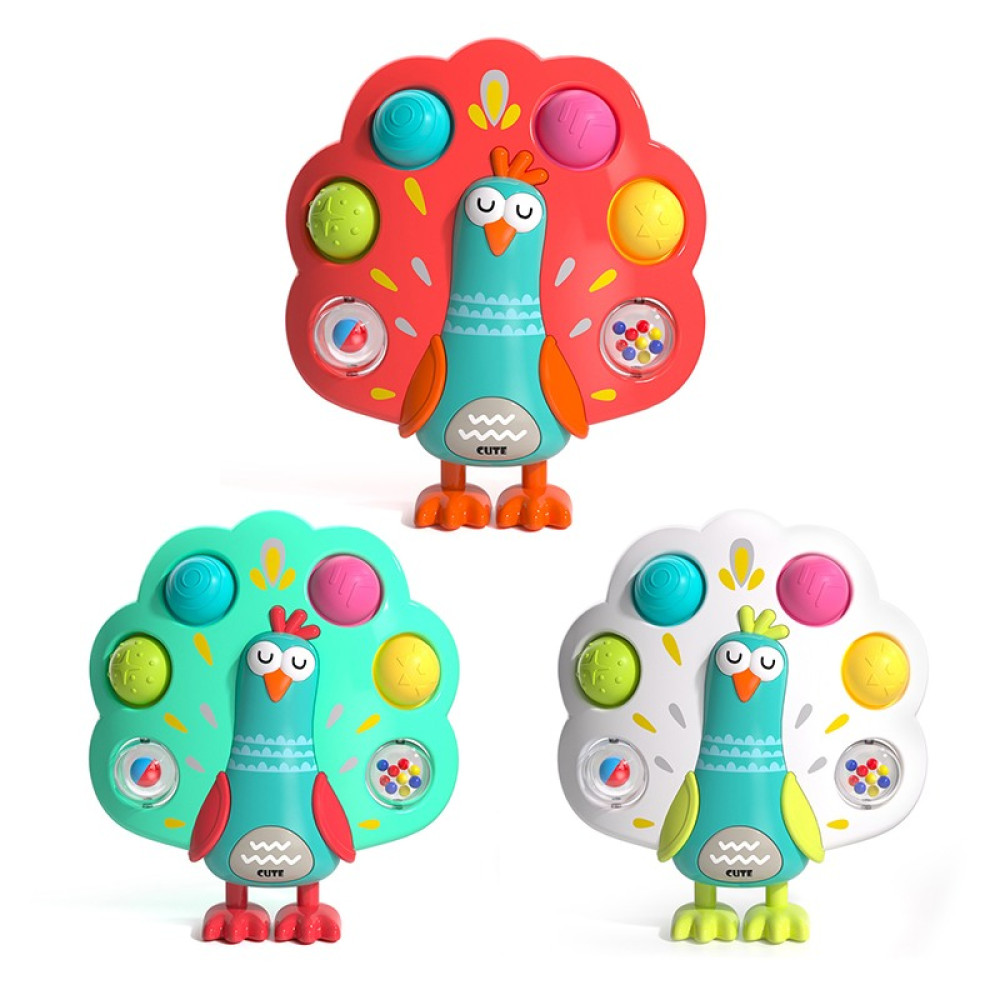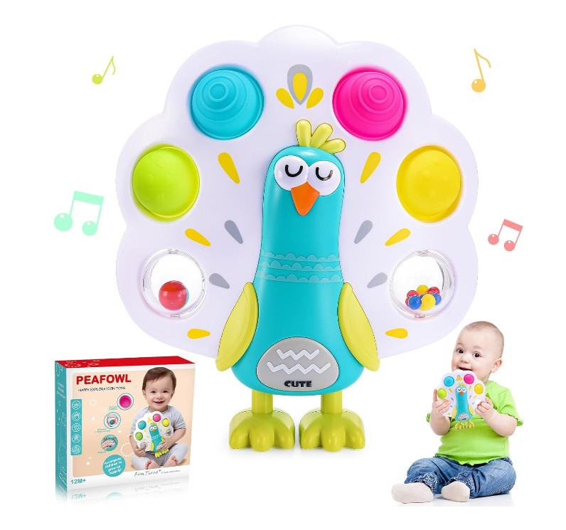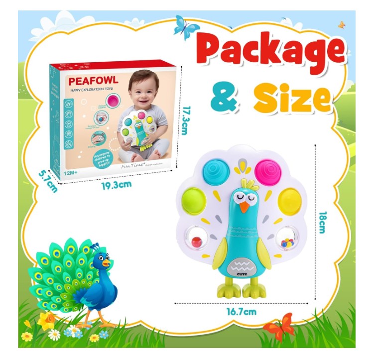 Această jucărie interactivă în formă de păun vesel și colorat este ideală pentru copiii de peste 12 luni, stimulând dezvoltarea motrică fină, coordonarea și atenția celor mici.
