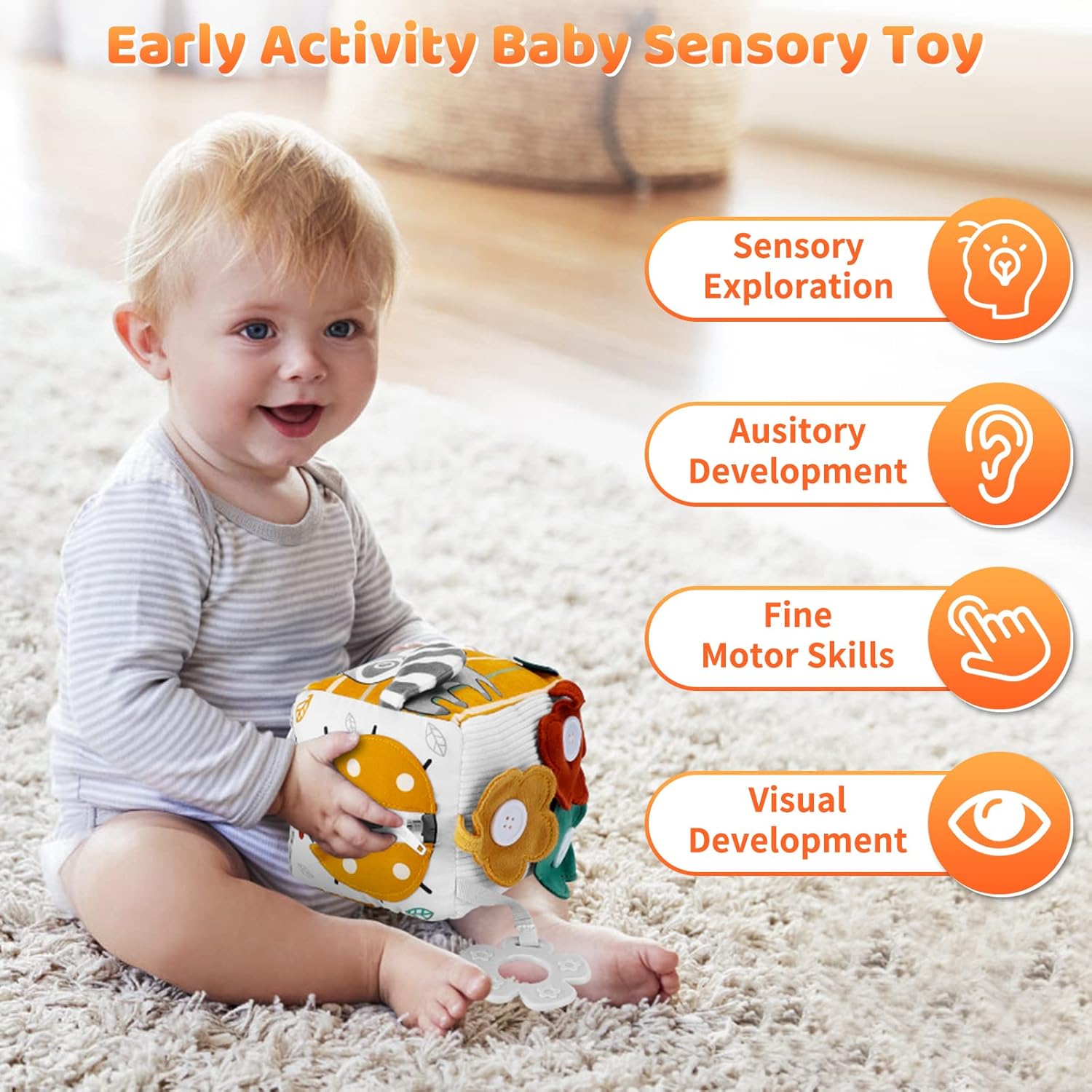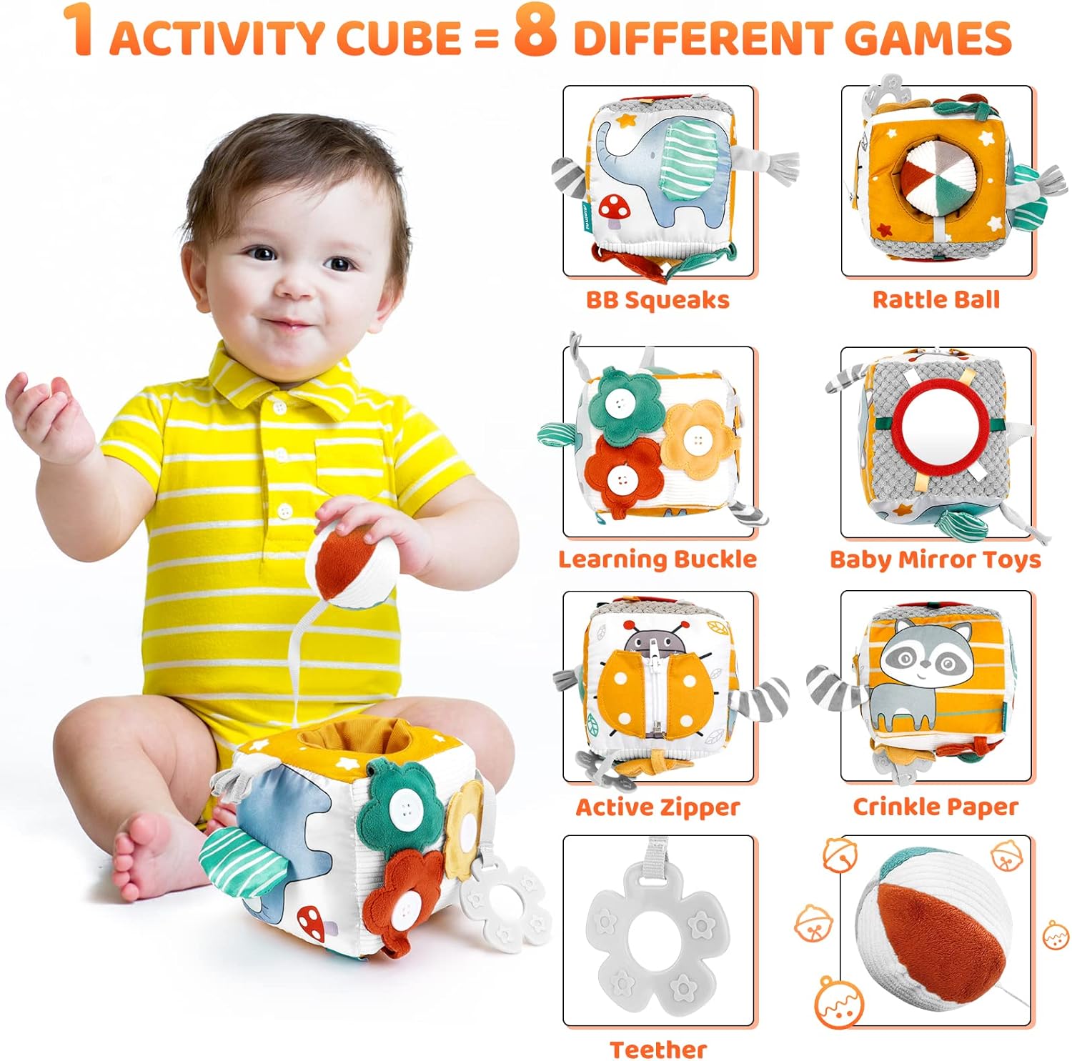 O jucărie versatilă, ideală pentru stimularea senzorială și dezvoltarea timpurie a bebelușului, potrivită încă de la 6 luni. Cubul textil include 8 activități interactive, gândite pentru a încuraja explorarea tactilă, vizuală și auditivă, dezvoltarea motricității fine și coordonarea mână-ochi: