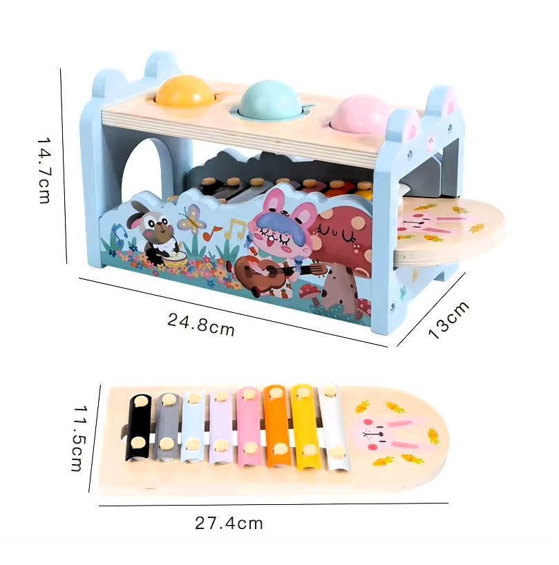 Descriere tehnică: Jucărie multifuncțională din lemn, formată dintr-o cutie solidă cu trei bile colorate și xilofon detașabil cu 8 note muzicale. Include un ciocănel din lemn și două baghete pentru xilofon.