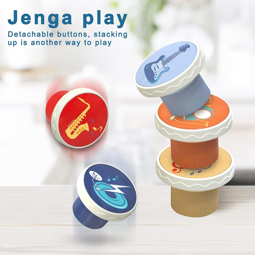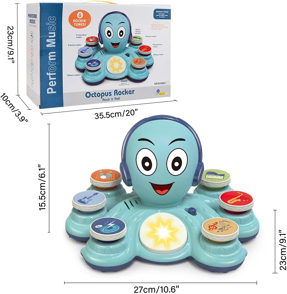 Dotată cu 6 butoane detașabile, fiecare reprezentând un instrument muzical (tobe, chitară, pian, saxofon etc.), caracatița oferă peste 28 de efecte sonore și melodii dinamice. Copiii pot apăsa, potrivi și înlocui piesele, antrenându-și coordonarea mână-ochi și dexteritatea fină.