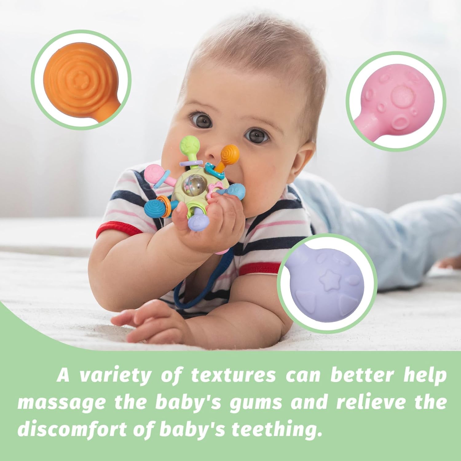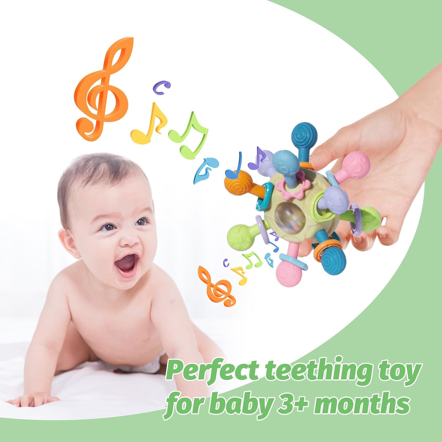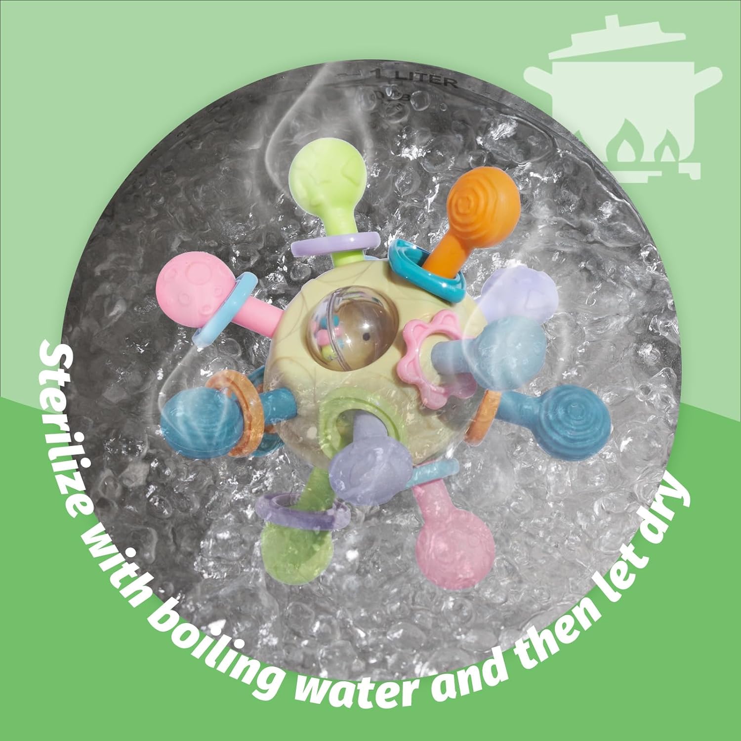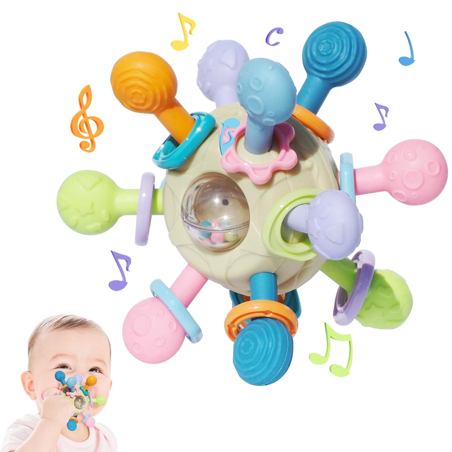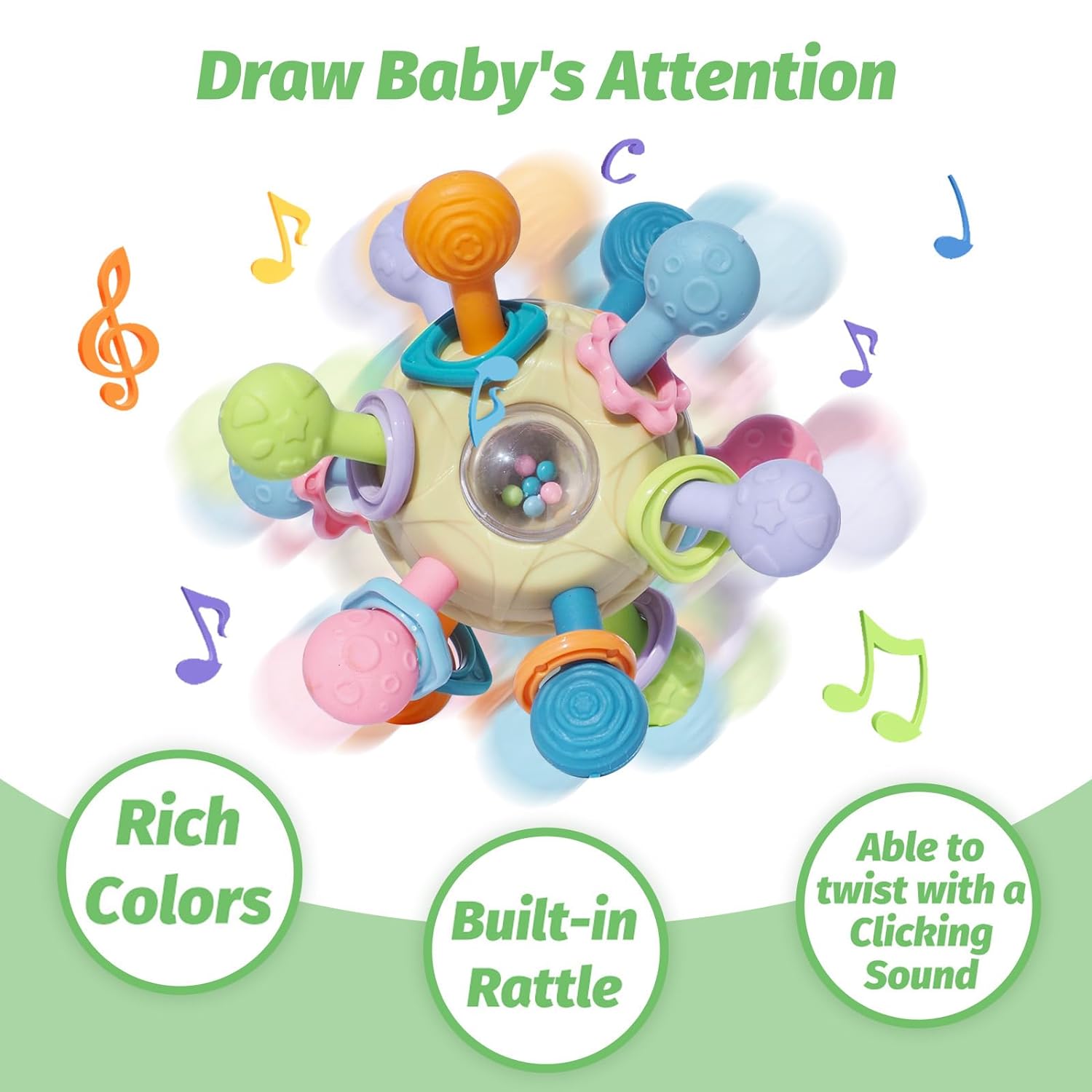 Aceasta minge senzoriala, jucarie de dentitie, este perfecta pentru exersarea abilitatilor motorii fine, auditive, vizuale si tactie ale celor mici. Acestia vor descoperi inelele de prindere, pe care atunci cand le vor roti, acestea vor emite click-uri, care le vor capta atentia micutilor.