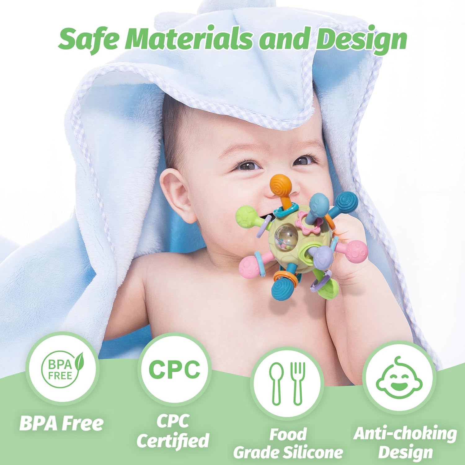 Jucaria respecta normele de siguranta EN71 si CPSIA, nu este toxica si nu contine BPA. Are un aspect placut, multicolor si este confectionata din materiale de cea mai buna calitate. Poate fi dezinfectata prin fierbere sau la aburi, astfel incat bebelusii vor avea in permanenta o jucarie sigura si curata.
