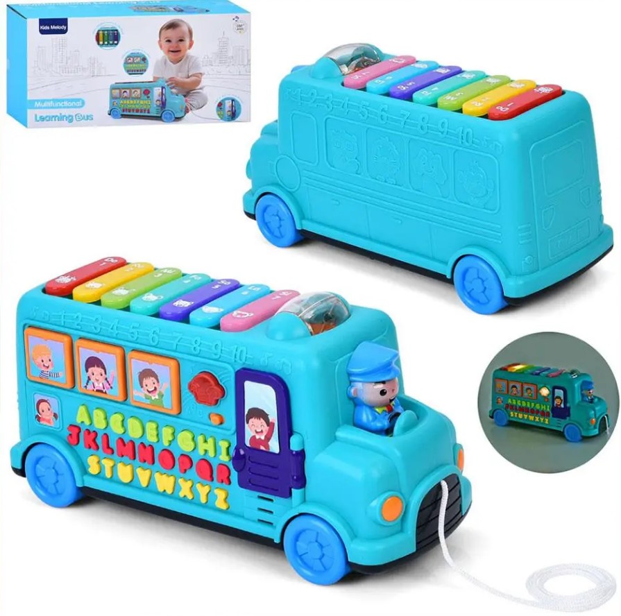 Copiii pot descoperi literele, culorile și notele muzicale apăsând tastele tip pian xilofon, pot deschide ușițele laterale, pot asculta sunete amuzante și pot trage autobuzul de sfoară, dezvoltându-și coordonarea și echilibrul.