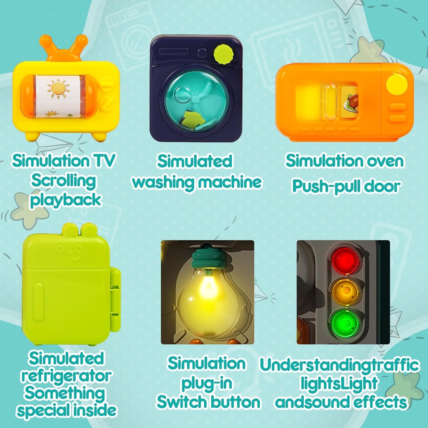 Simulări realiste: mașină de spălat, cuptor, frigider, televizor, comutator de lumină, semafor cu lumini și sunete.