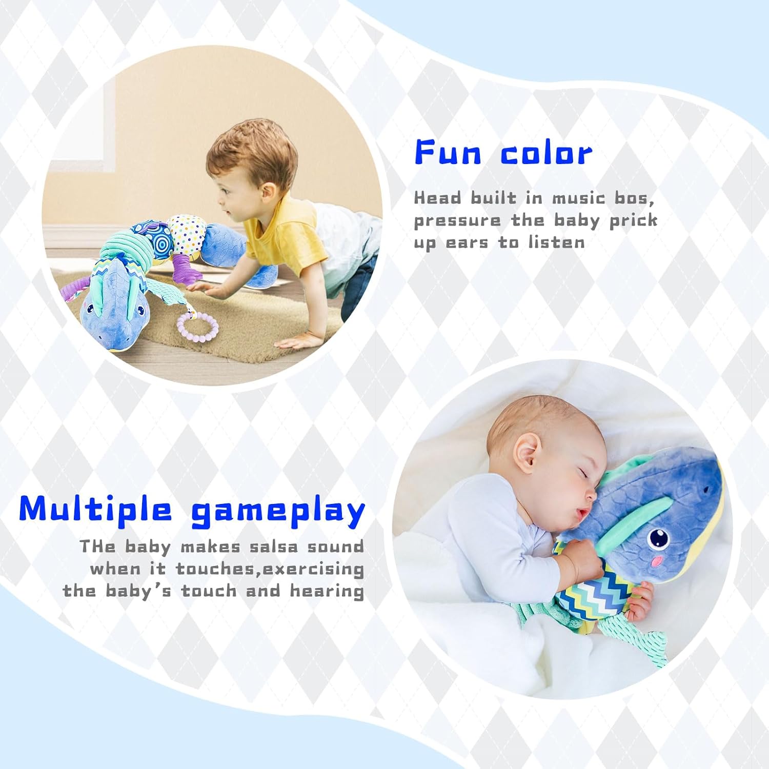- Versatilă și educativă: Jucăria servește atât ca prieten de pluș pentru alinare, cât și ca instrument educativ. Prin joc, bebelușul își dezvoltă coordonarea mână-ochi (prinzând și agitând omida), abilitățile motorii fine și grosiere, precum și percepția cauză-efect (observând că mișcarea produce sunete).