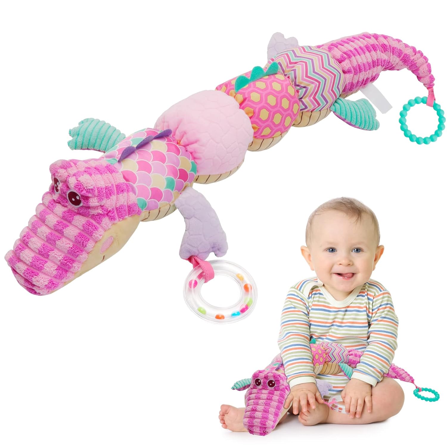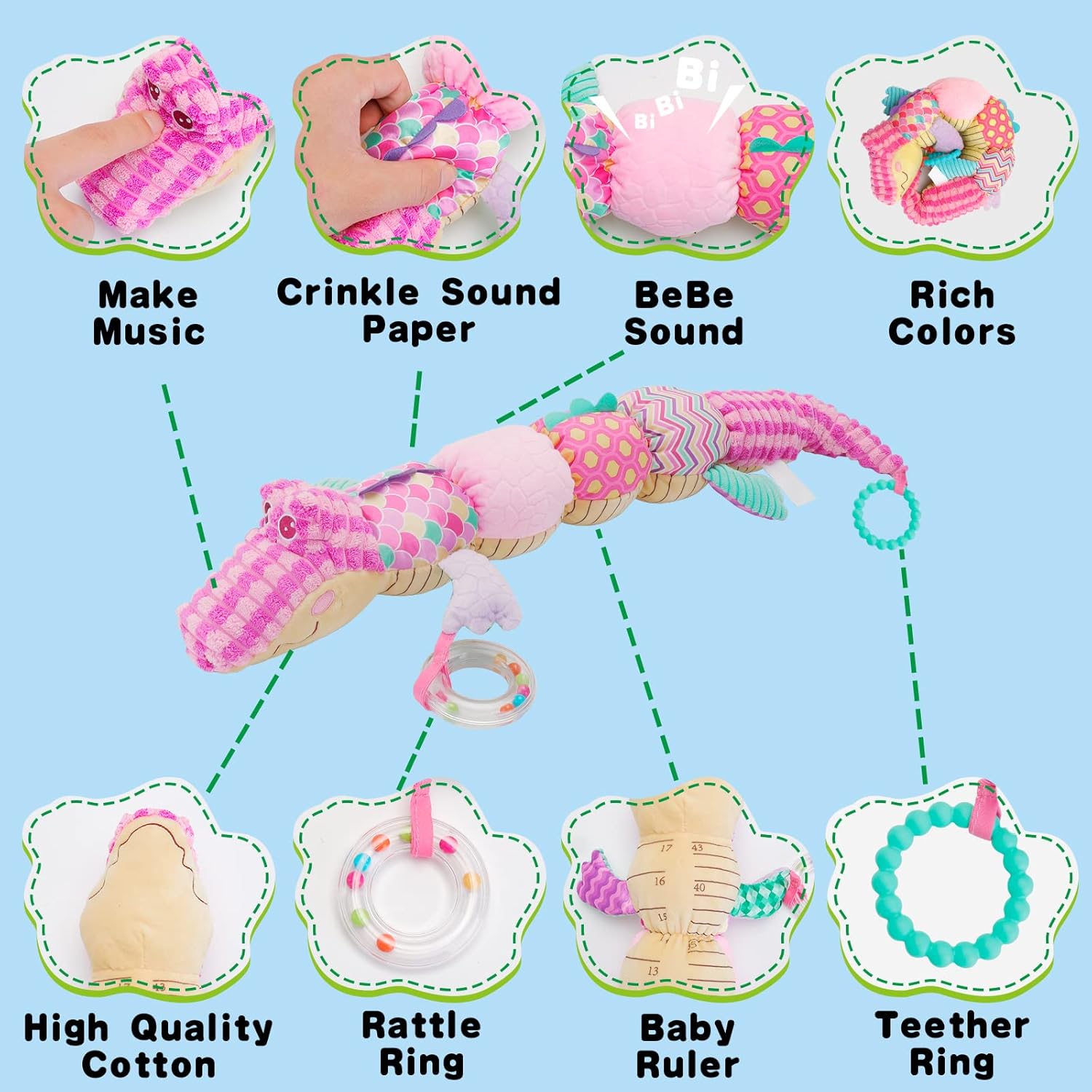 Această jucărie moale și senzorială în formă de crocodil este perfectă pentru bebelușii de la 0 luni în sus, oferind o experiență tactilă, vizuală și auditivă stimulativă. Concepută pentru a sprijini dezvoltarea timpurie a celor mici, această jucărie multifuncțională combină un material moale și plăcut la atingere cu elemente interactive care îi vor captiva pe bebeluși.