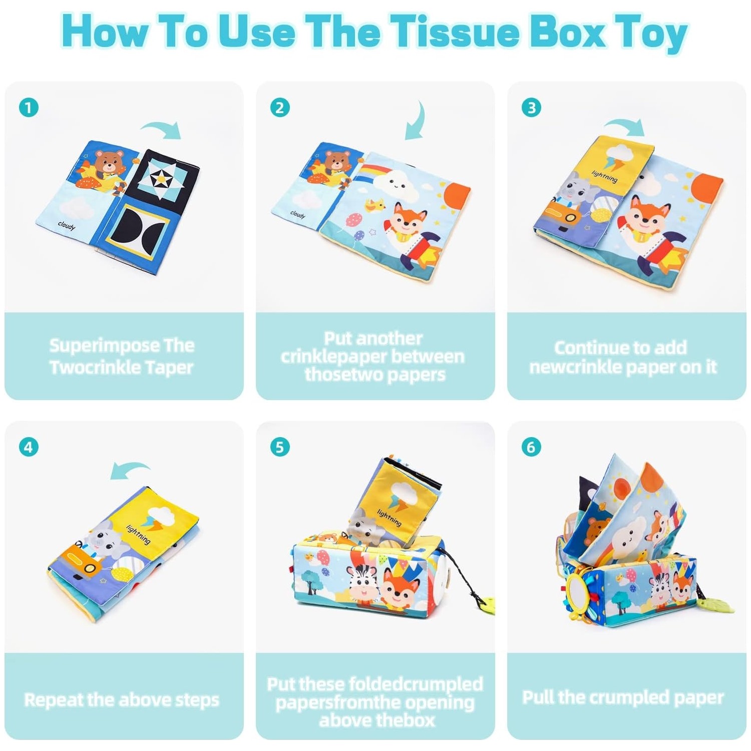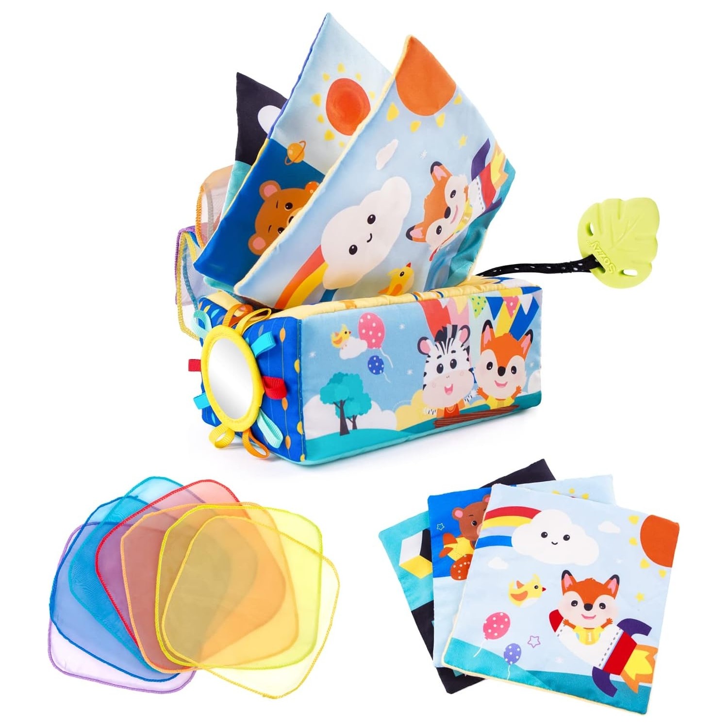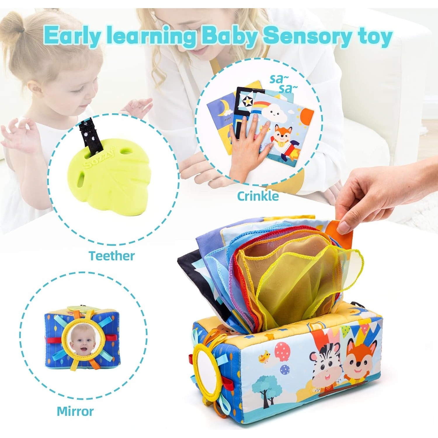 Această jucărie senzorială, cunoscută sub numele de „Cutia cu batiste”, este special concepută pentru bebelușii cu vârsta de la 0 luni în sus. Jucăria oferă o experiență multisenzorială prin intermediul materialelor moi, culorilor vii și texturilor variate, stimulând simțurile copilului.