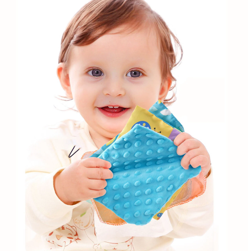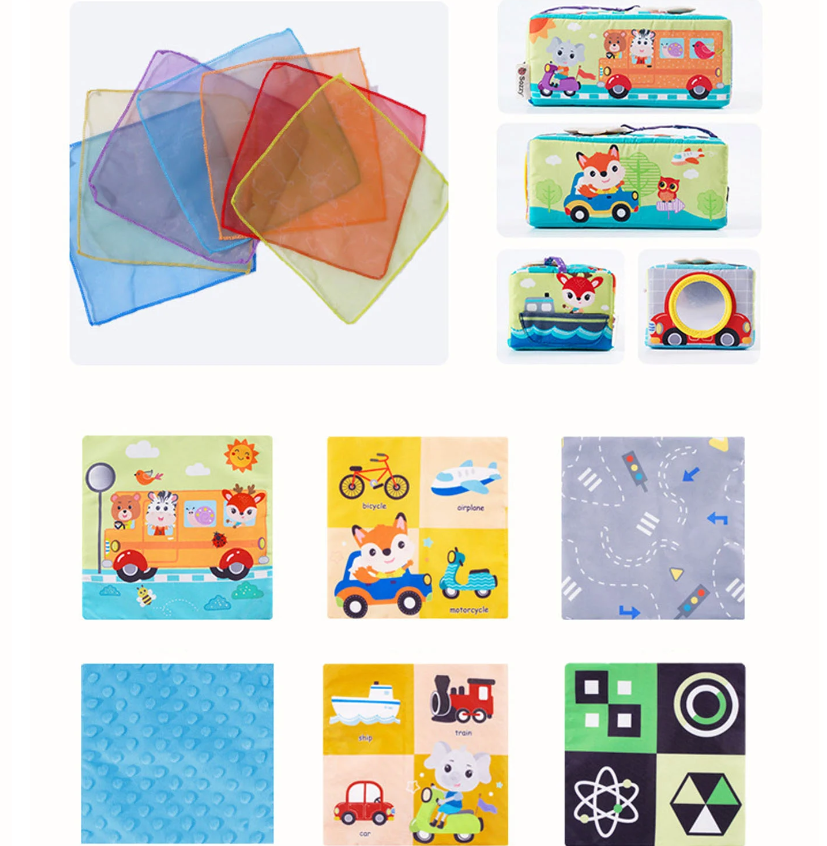 - Materiale de Calitate: Cutia și batistele sunt fabricate din materiale textile moi și sigure pentru bebeluși, fără componente mici care ar putea fi înghițite. Batistele sunt confecționate din țesături fine, fiecare având o textură diferită, contribuind la dezvoltarea simțului tactil.