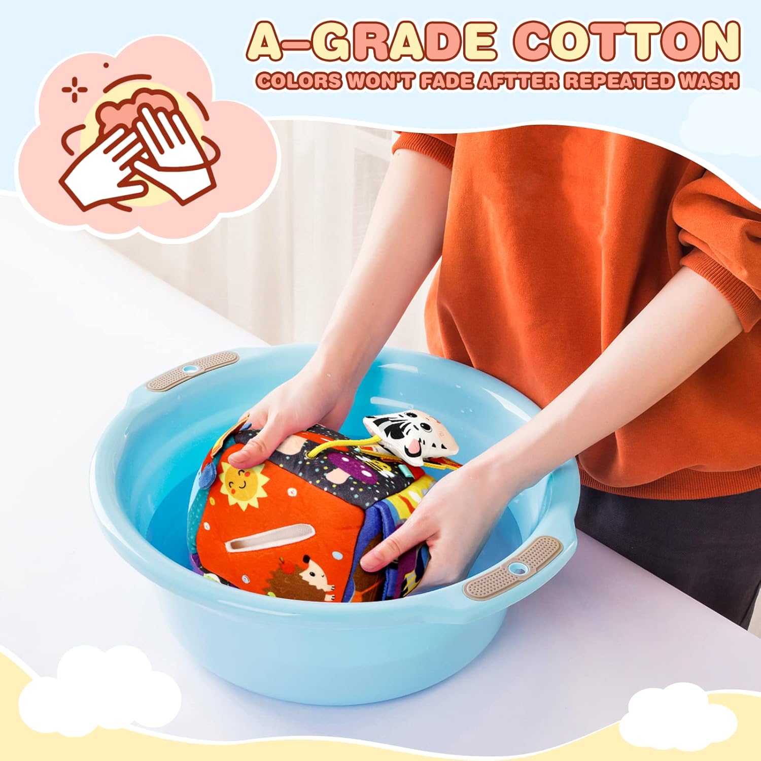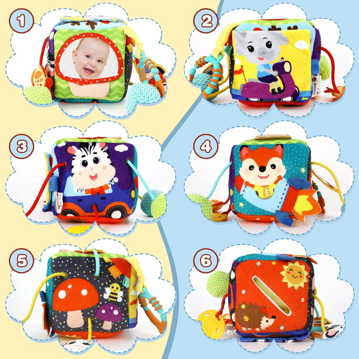 - Cubul include diverse texturi și materiale moi, care oferă o experiență tactilă bogată, esențială pentru dezvoltarea senzorială a bebelușului.
