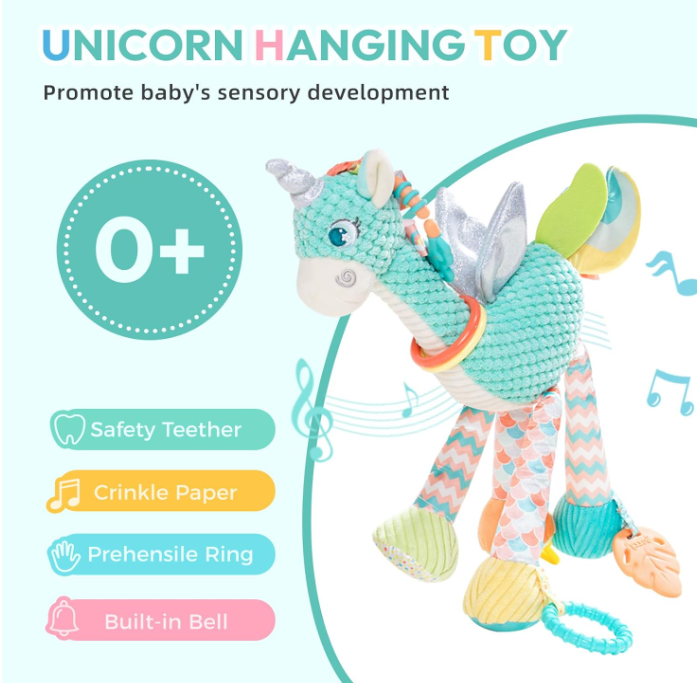 Această jucărie unicorn este un cadou perfect pentru orice nou-născut, contribuind la dezvoltarea armonioasă și sănătoasă a acestuia prin joc și descoperire senzorială.