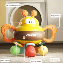 - Funcții multiple: Albinuta se poate răsuci la 360 de grade, emitând sunete clic-clic care încântă bebelușii și le stimulează simțul auditiv. Acest mecanism de răsucire ajută la dezvoltarea coordonării mână-ochi și a abilităților motorii fine.