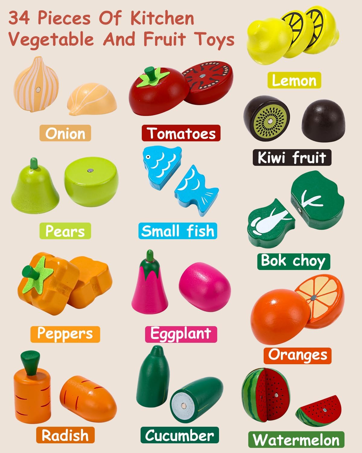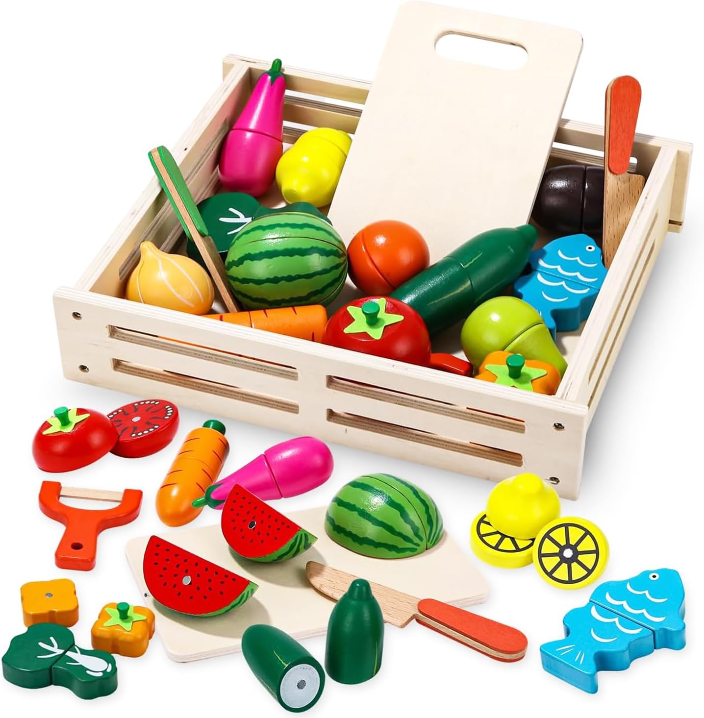 Acest set educativ din lemn include o lădiță cu 14 fructe și legume colorate, special concepute pentru a stimula imaginația și abilitățile motrice ale copiilor. Fiecare piesă este realizată din lemn natural și prezintă culori vii, care îi ajută pe cei mici să învețe despre diferitele tipuri de alimente.