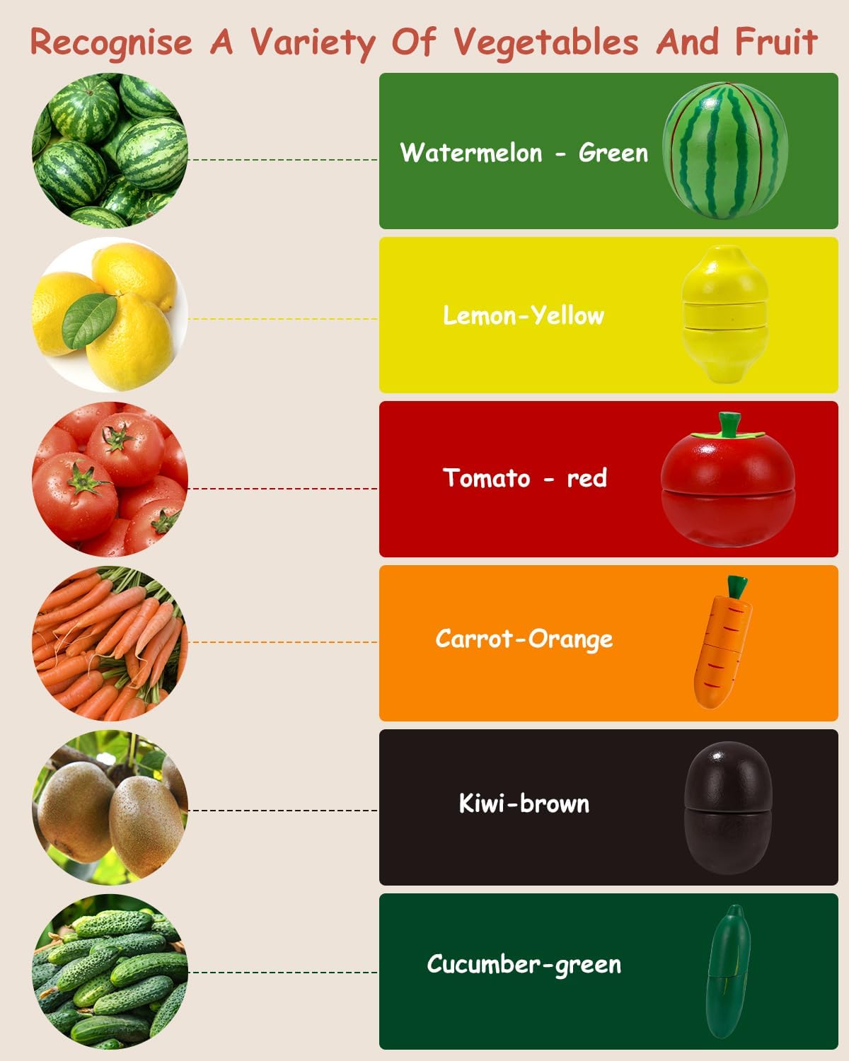 - Cunoaștere senzorială și cognitivă: Ajută la recunoașterea culorilor și formelor, dar și la învățarea denumirilor diferitelor fructe și legume.
