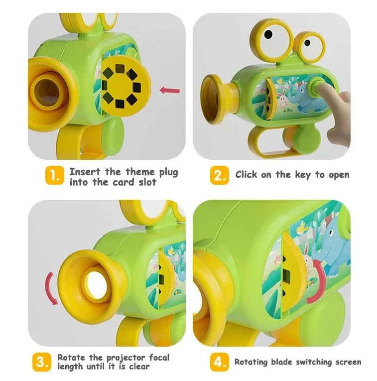 Lanterna proiector cu design amuzant și culori vii este perfectă pentru micuții curioși care adoră să descopere lumea prin imagini captivante.