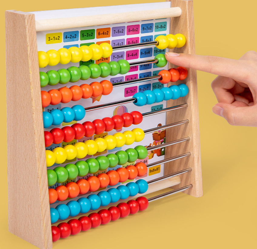 Abacul este prevăzut cu bile colorate în roșu, galben, verde, albastru și portocaliu, care sunt dispuse pe tije metalice. Fiecare tijă are câte 10 bile, iar copilul poate muta bilele dintr-o parte în alta pentru a învăța să numere, să adune și să scadă. De asemenea, pe spatele abacului sunt prezente tabele cu litere și tabele de înmulțire, oferind astfel posibilitatea de a învăța alfabetul și operațiile matematice de bază într-un mod vizual și interactiv.
